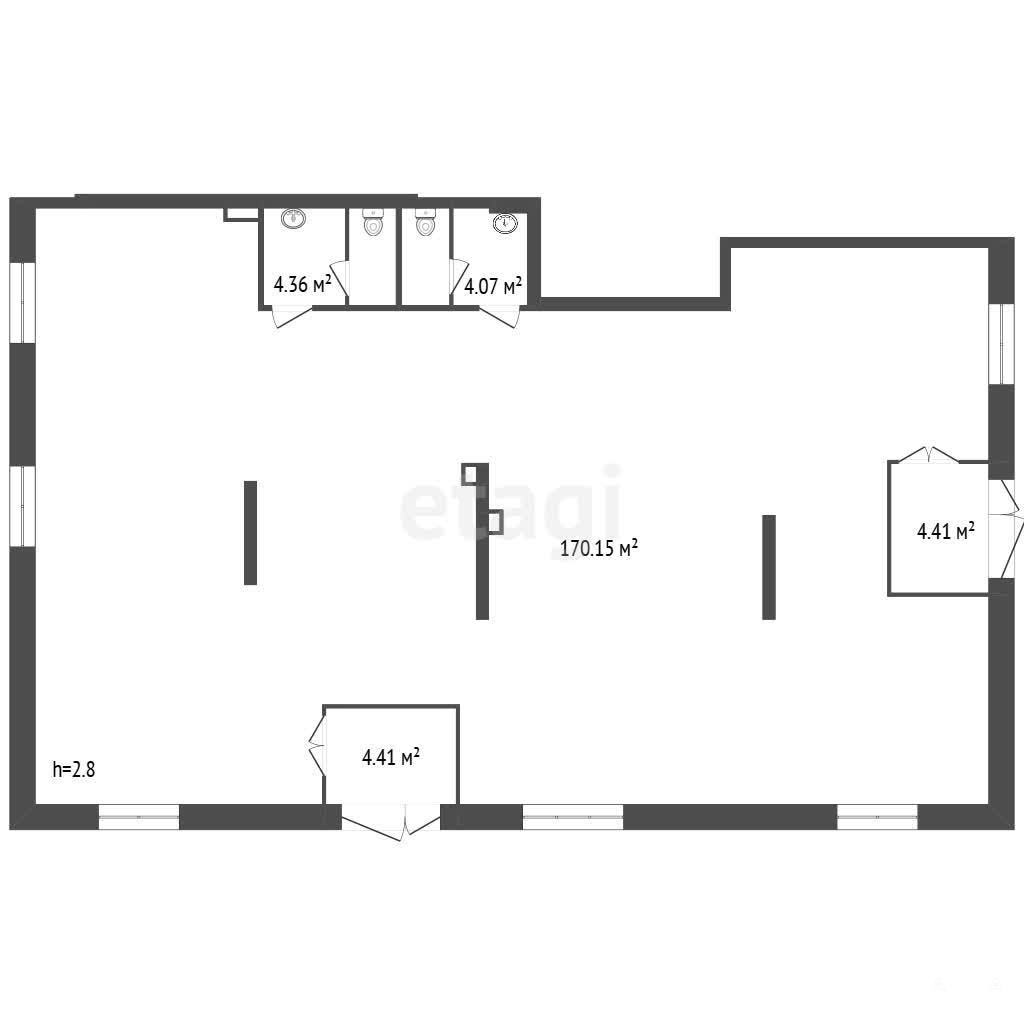 Помещение свободной планировки. Имеется 2 изолированных входа, с торца здания и с фасадной части. Отделка — предчистовая, выполнена стяжка пола, оштукатурены стены, заведены все коммуникации: электричество, отопление, водопровод, канализация. 2 раздельных санузла. Много света, т. к. в помещении 6 окон.
