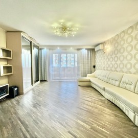 Продается великолепная квартира 97, 4 кв. м с кухней-гостиной 40 кв. м. Одна комната 20, 15 кв. м, вторая — 21, 7 кв. м. Со всех комнат есть выход на балкон. В квартире огромный балкон, остеклен, обшит вагонкой. Санузел в кафеле. Полностью в квартире сделан евроремонт. Всё остается,...