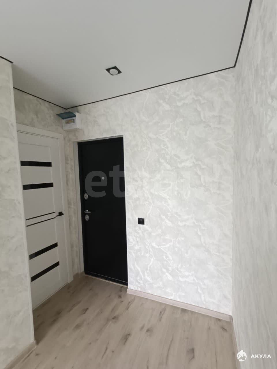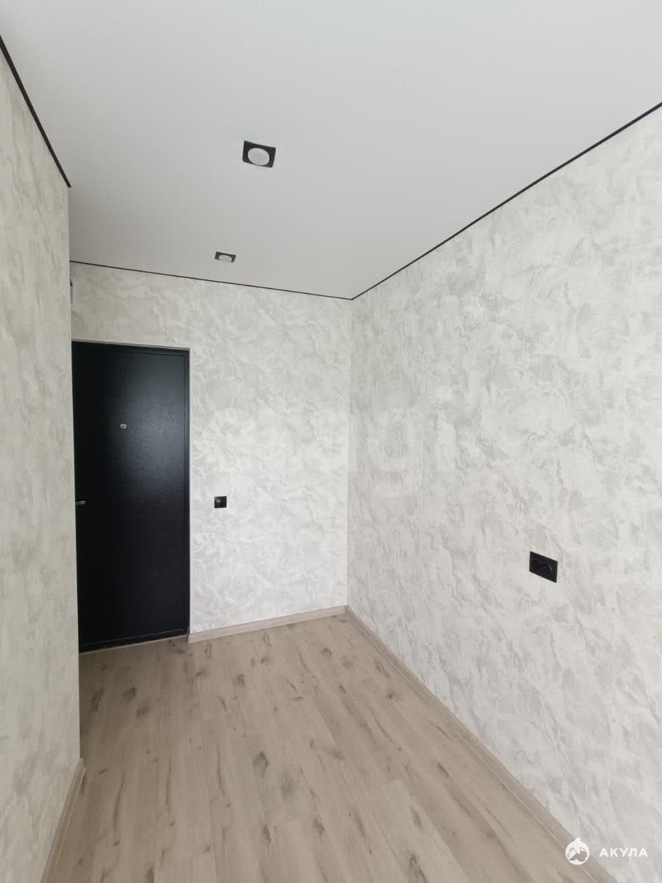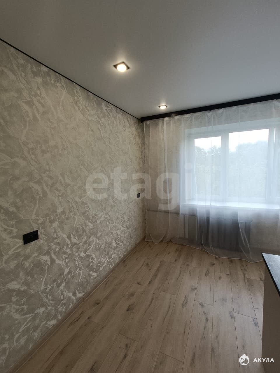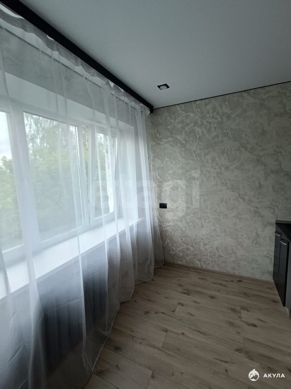 В комнате сделан современный ремонт: натяжные потолки, на полу ламинат, установлено пластиковое окно, входная металлическая дверь.