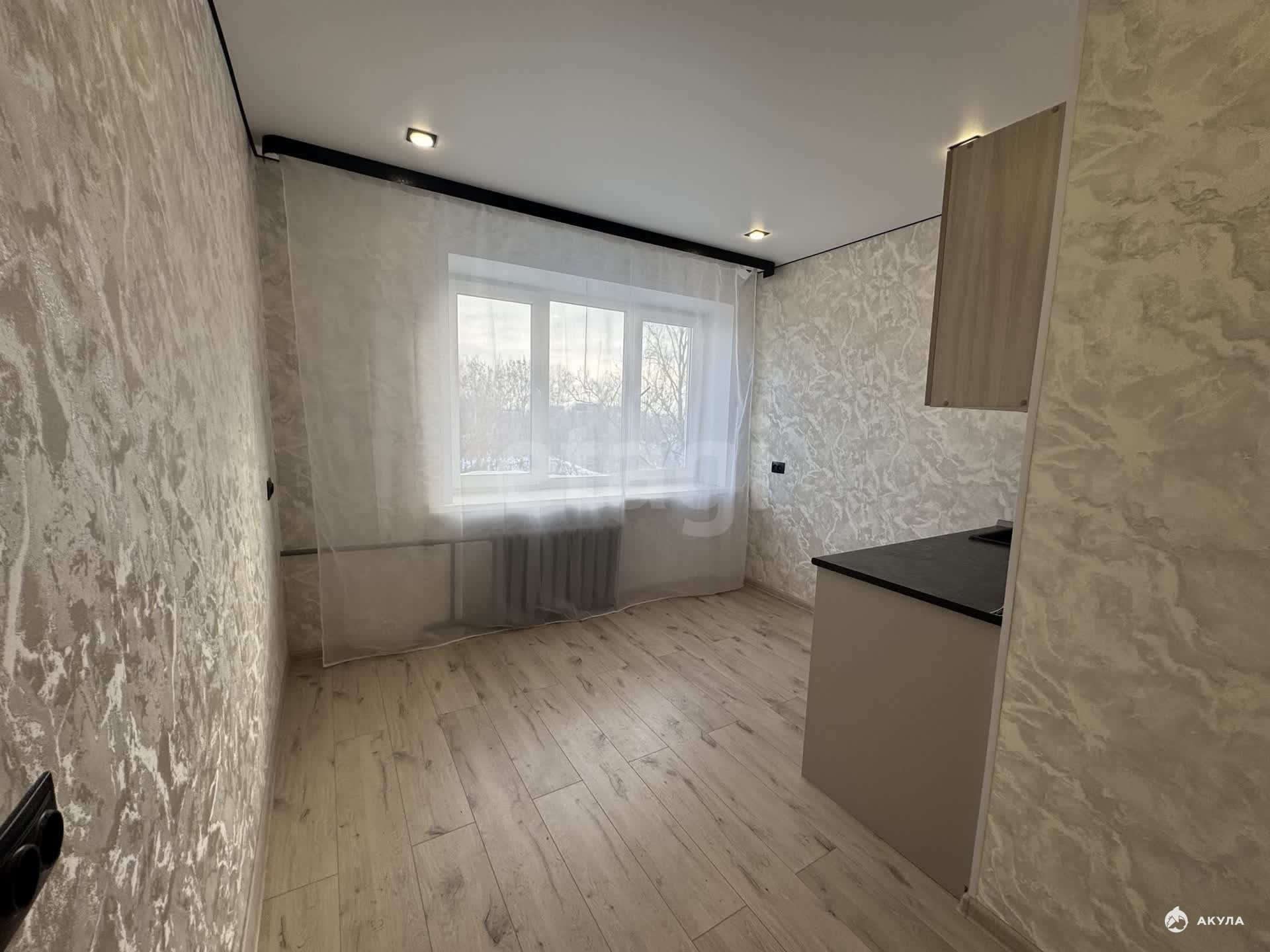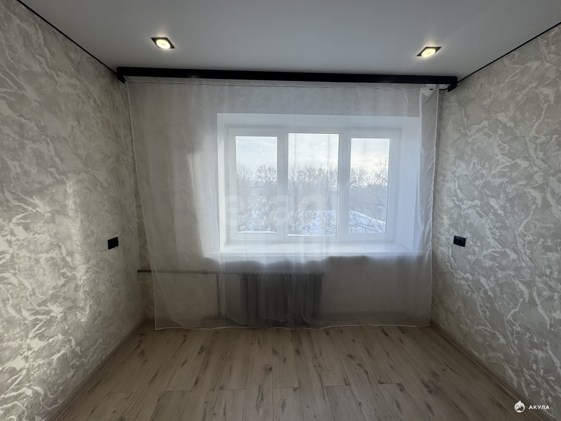 В комнате сделан современный ремонт: натяжные потолки, на полу ламинат, установлено пластиковое окно, входная металлическая дверь.