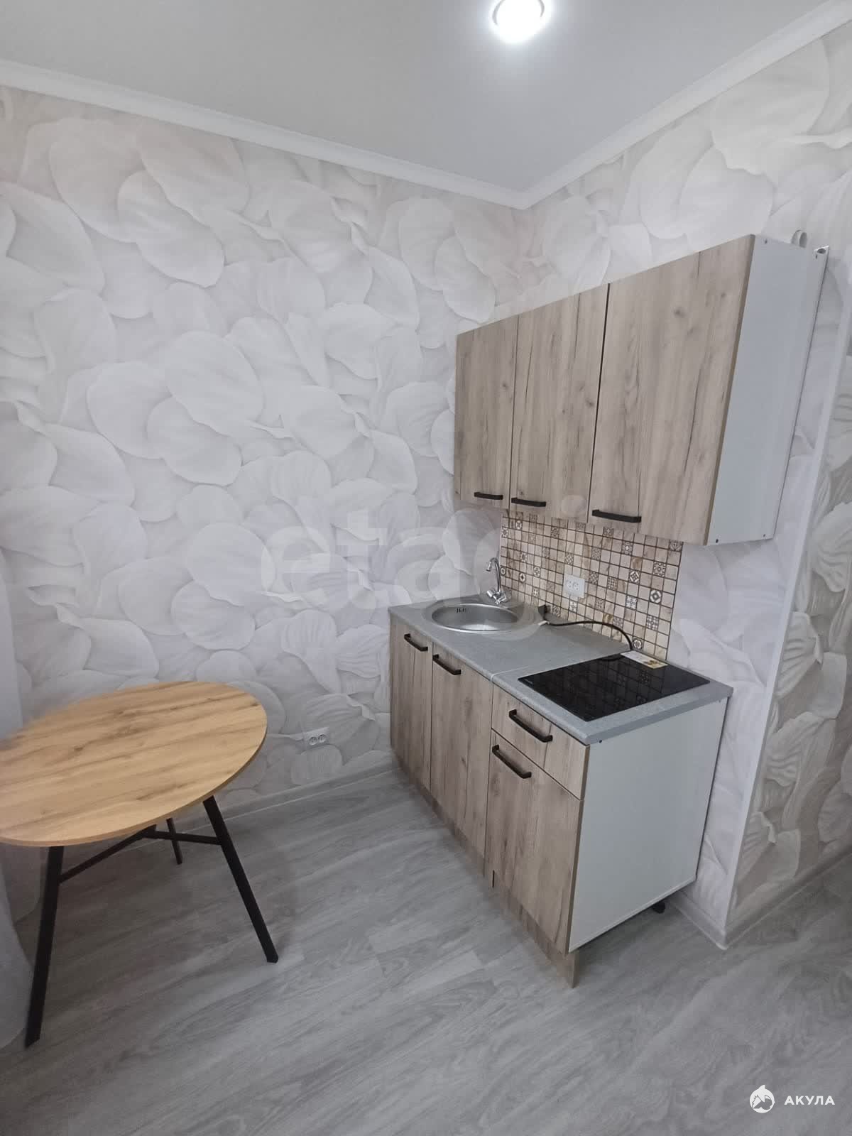 Комната полностью укомплектована необходимой мебелью, включая кухонный пенал, мягкую мебель, шкаф для хранения, стулья и журнальный стол, что позволяет заселиться без дополнительных затрат.