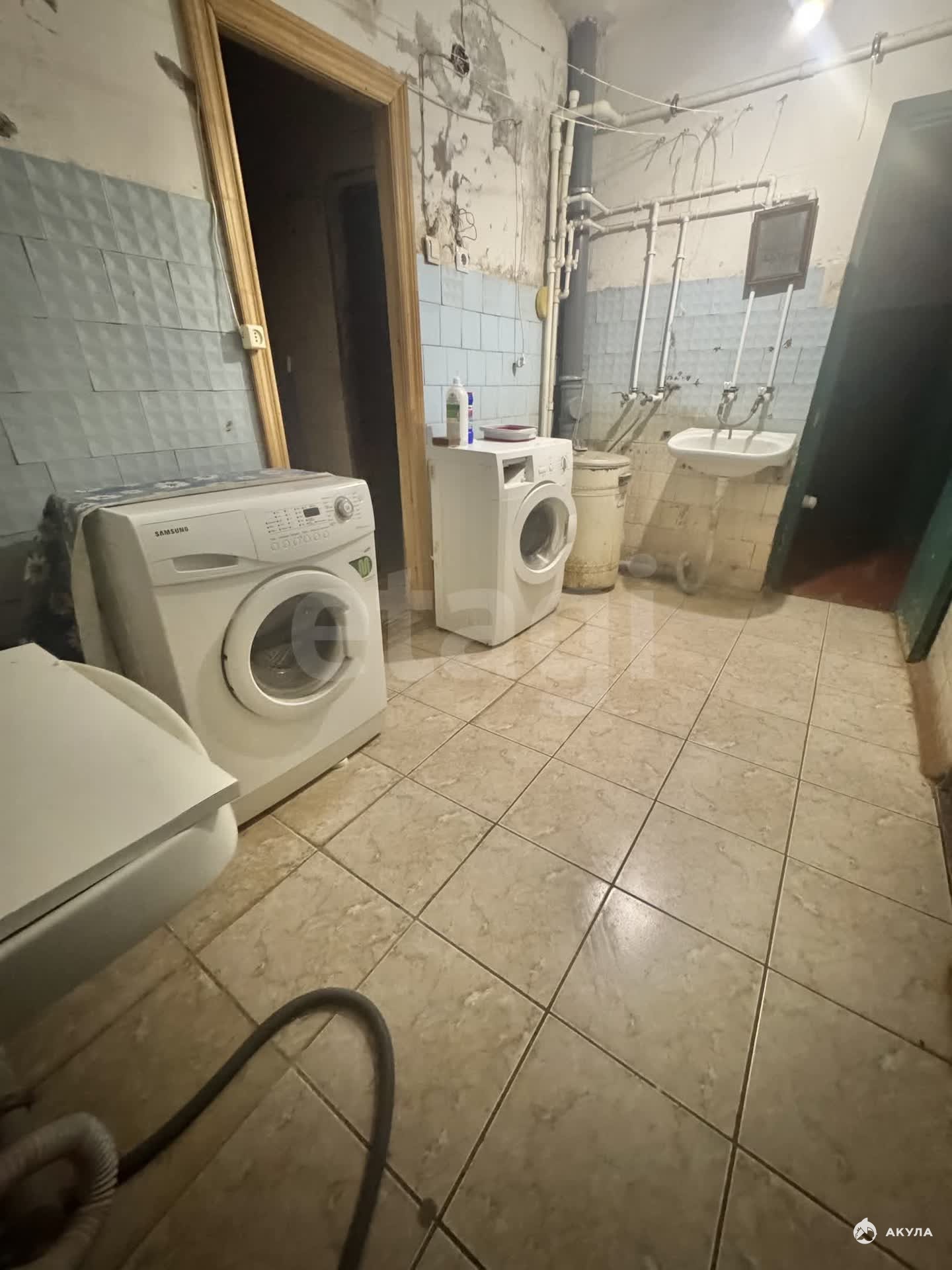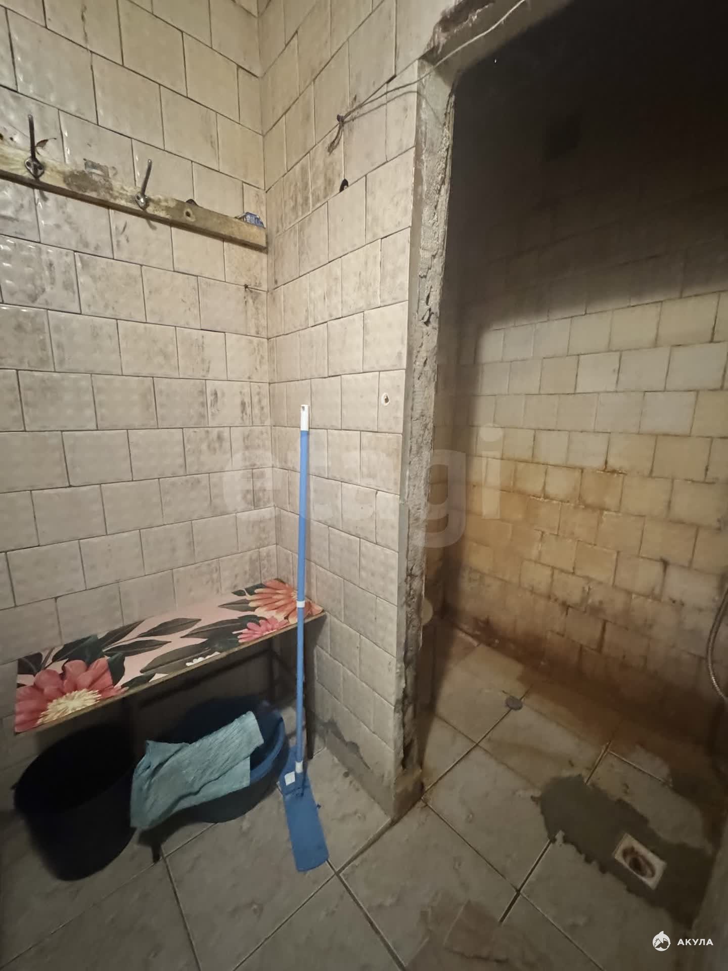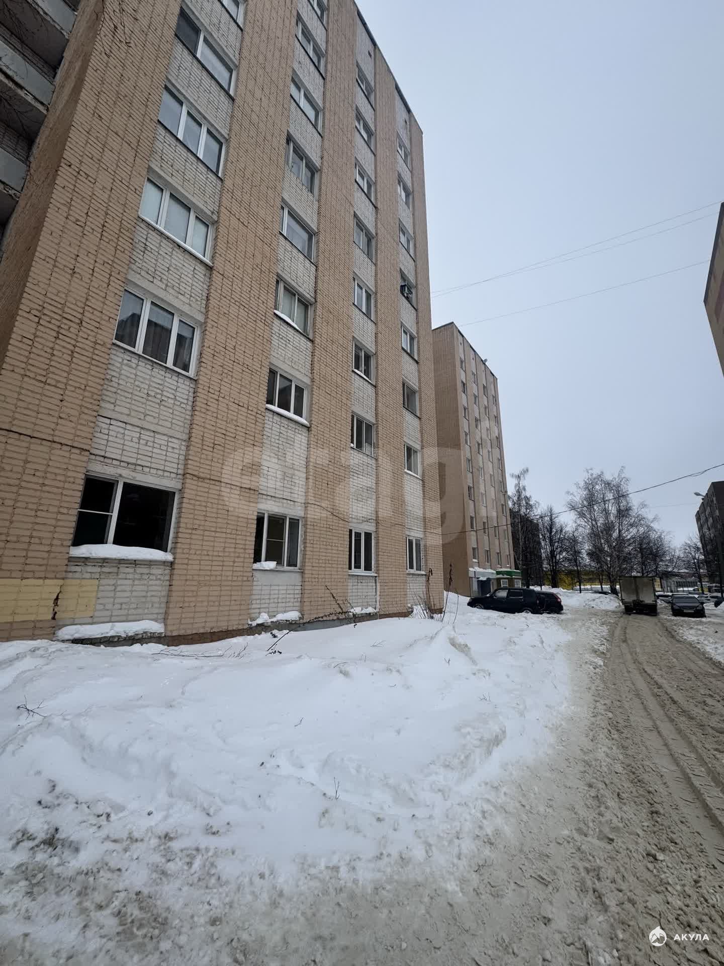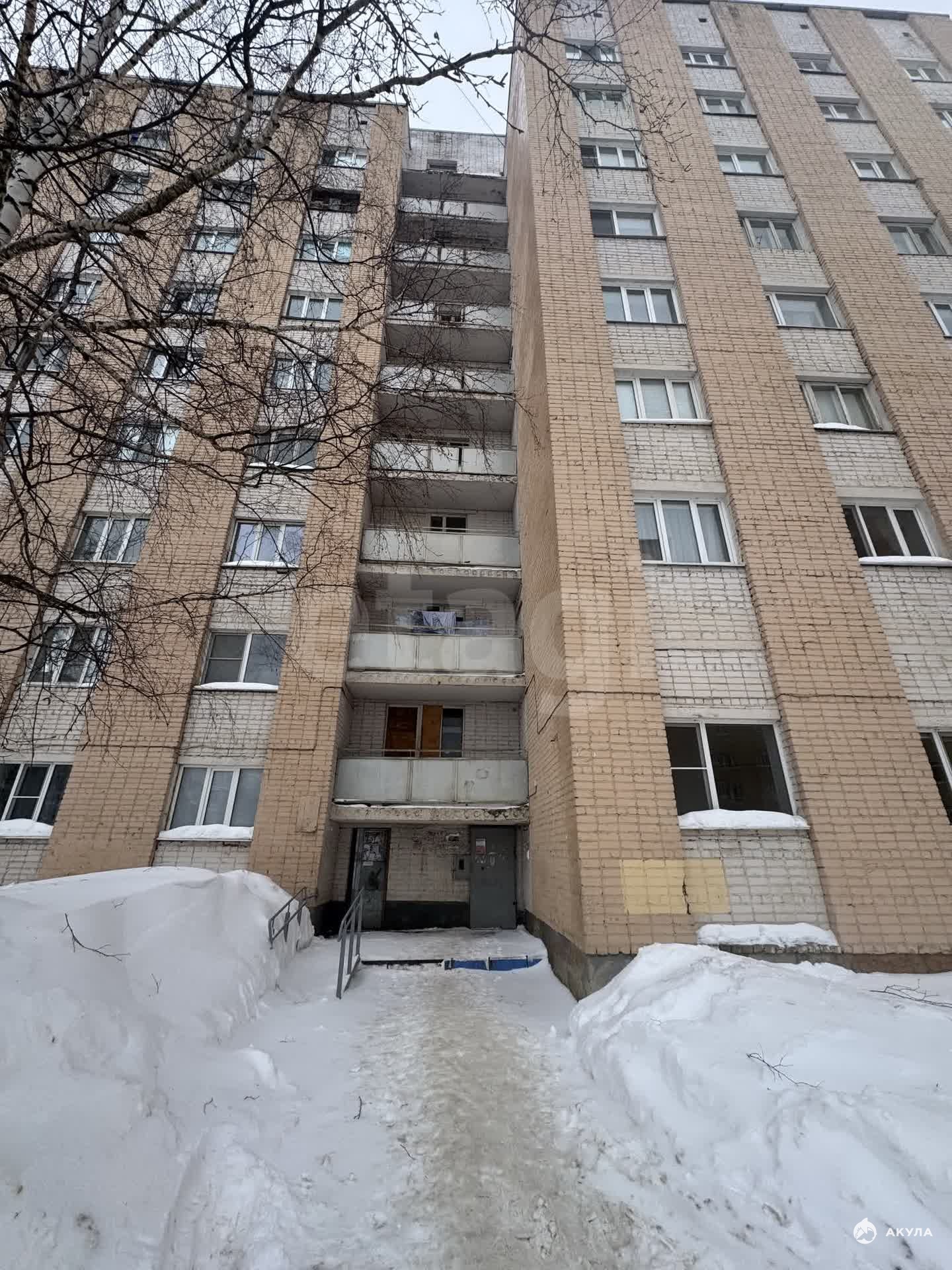 Комната расположена на 8-м этаже 9-этажного кирпичного дома. Отопление центральное. Не угловая, установлены чугунные батареи. Секция на 8 комнат. 2 душа, 2 туалета, кухня в секции. В комнате деревянные окно и дверь. Напольное покрытие — линолеум.