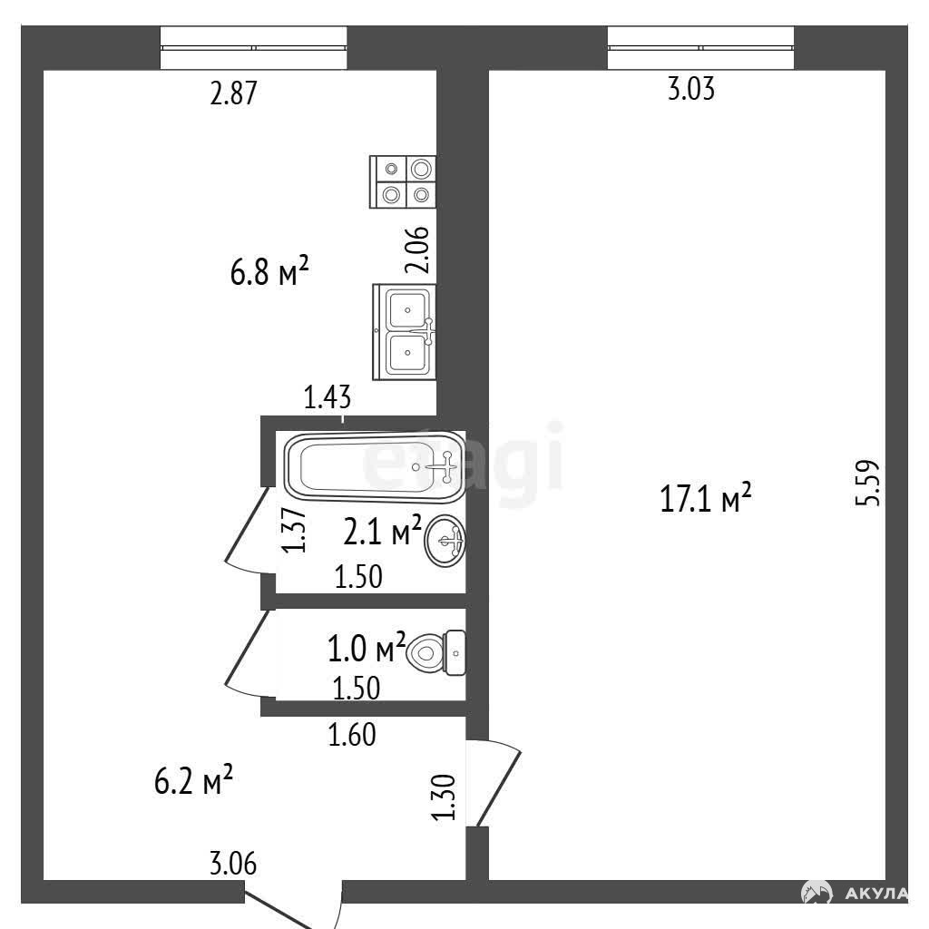 Параметры квартиры: зал — 17, 1 кв. м., кухня — 6, 8 кв. м., прихожая — 6, 2 кв. м., ванная комната — 2, 1 кв. м., туалет — 1 кв. м. Балкон в квартире отсутствует.