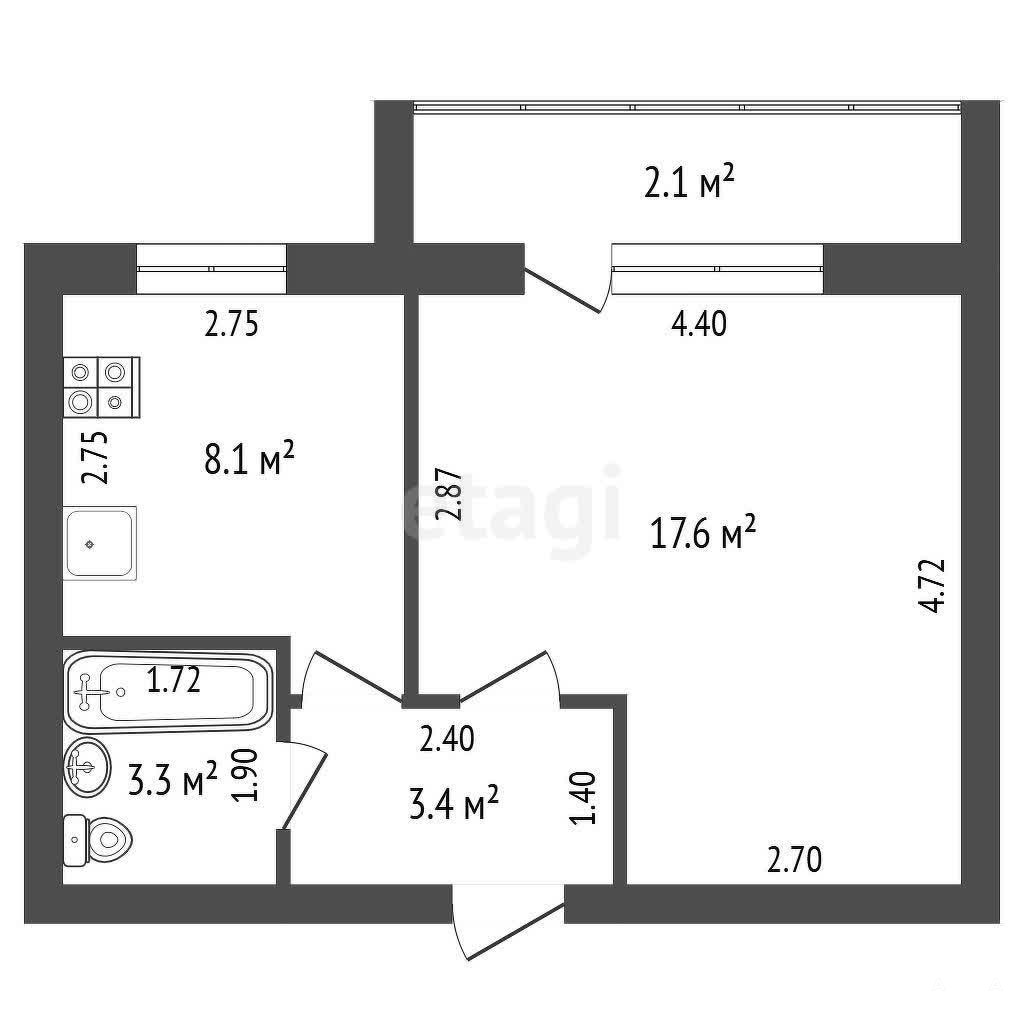 Квартира не угловая. Общая площадь без учета балкона составляет 32, 4 кв. м. Комната 17, 6 кв. м, кухня 8, 1 кв. м.