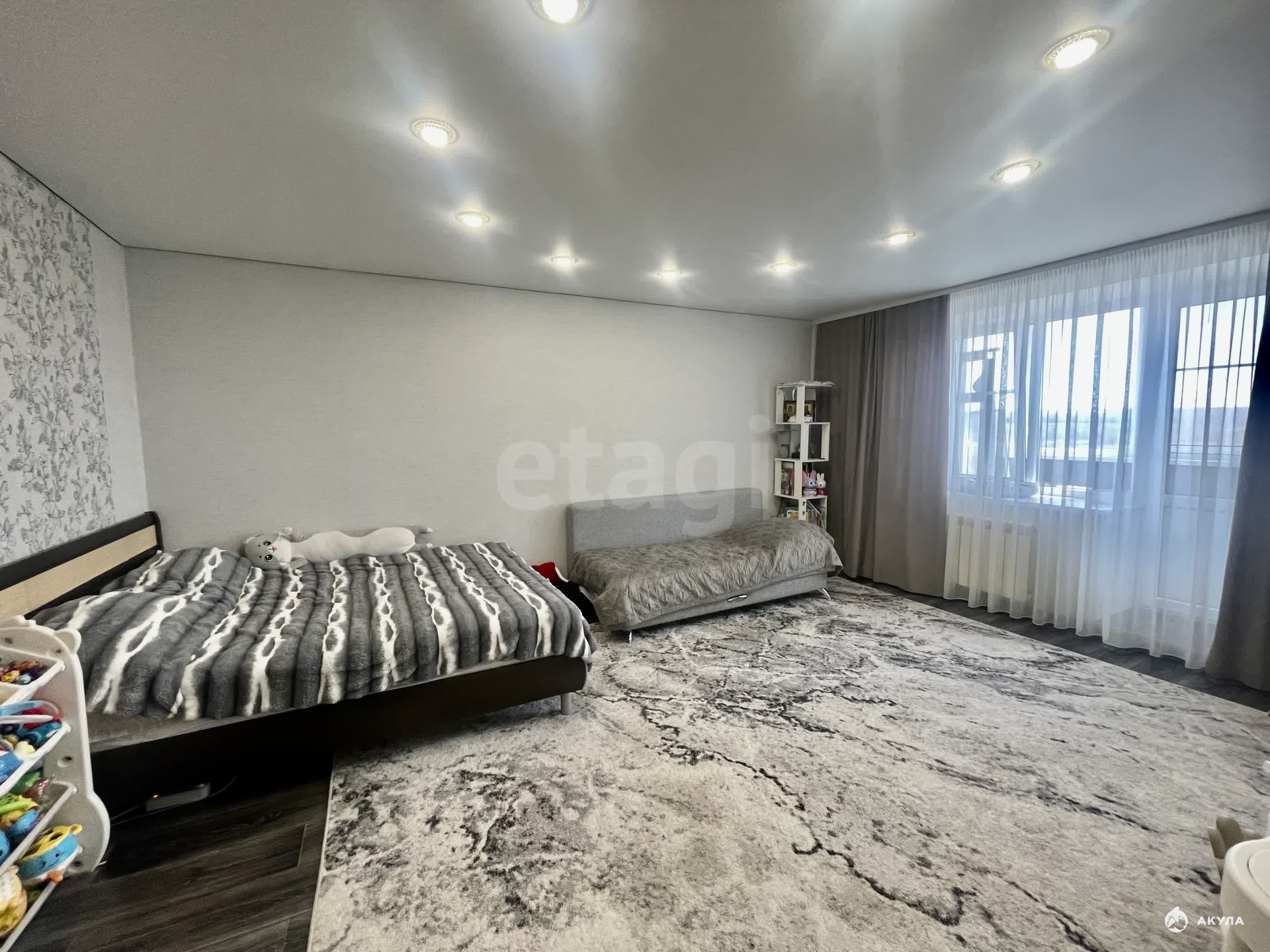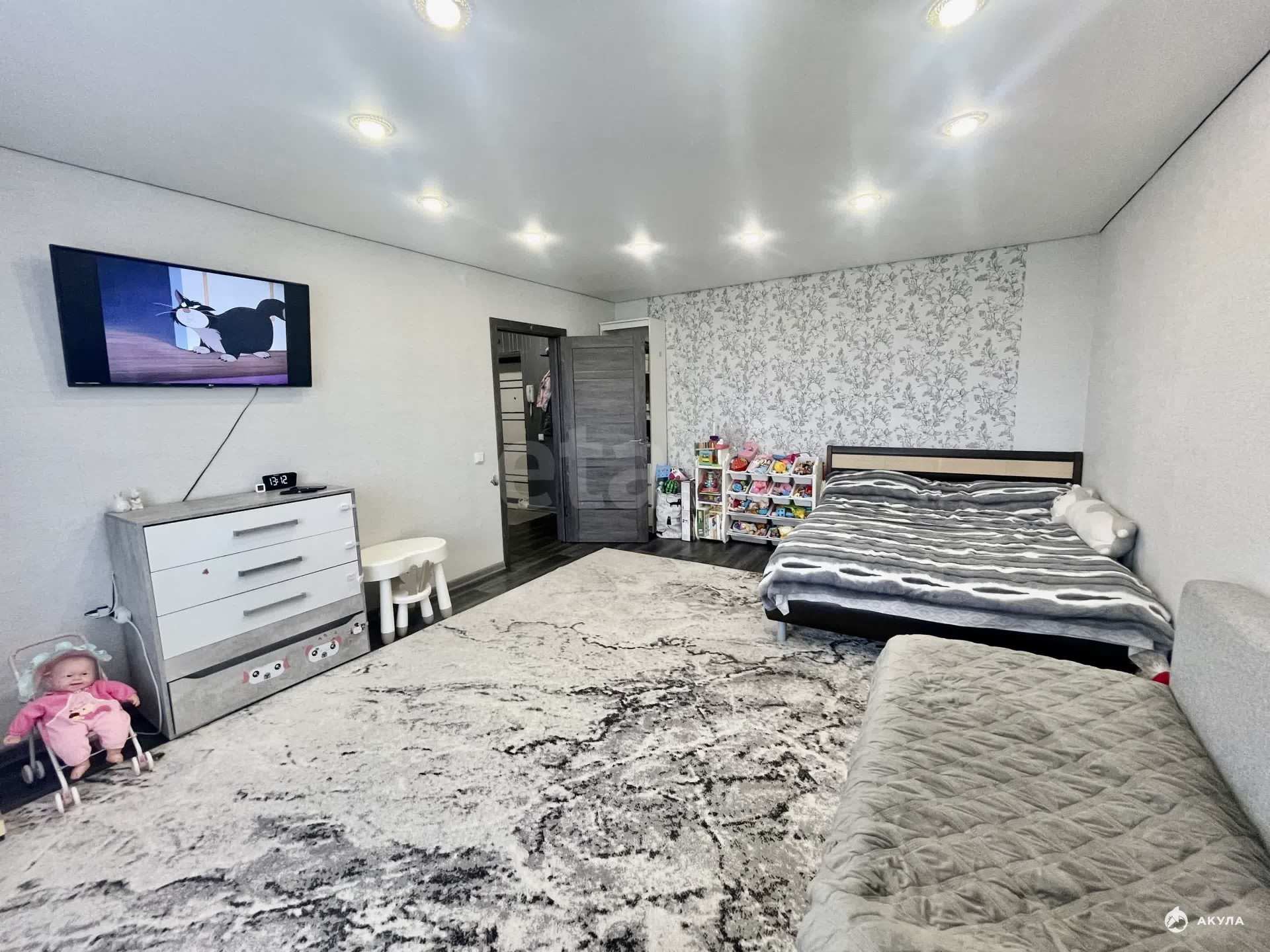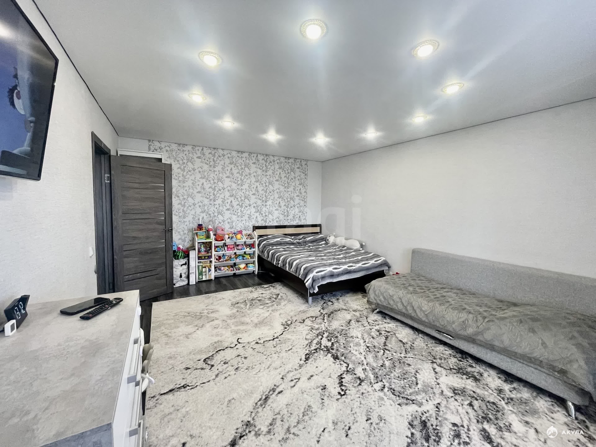 Во всех комнатах сделан ремонт, потолки натяжные, на полу линолеум.