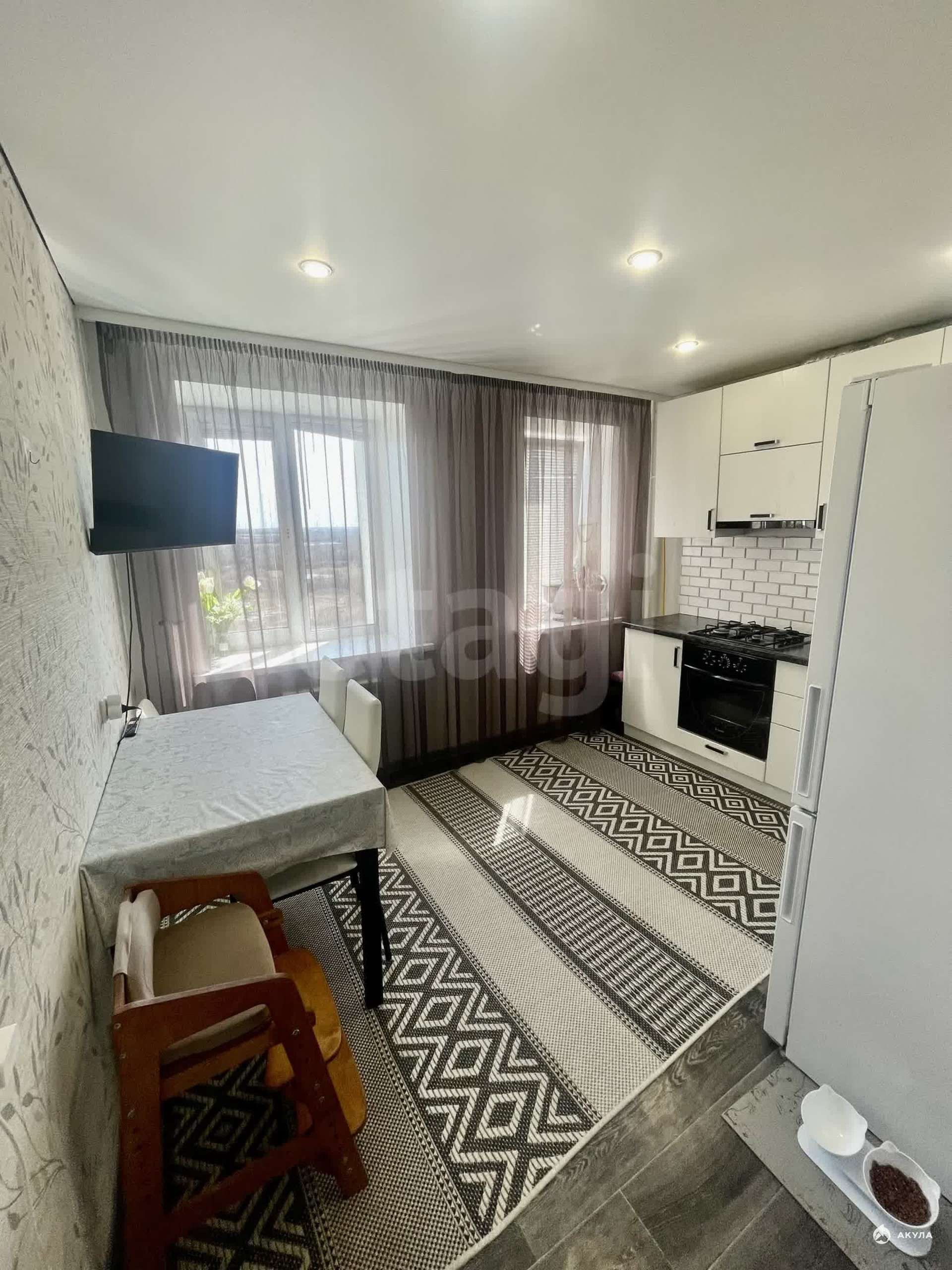 Просторная кухня — 11 м.кв., которая используется как кухня-гостиная, с двумя окнами, благодаря чему в комнате очень светло и уютно. Из окон открывается прекрасный вид.