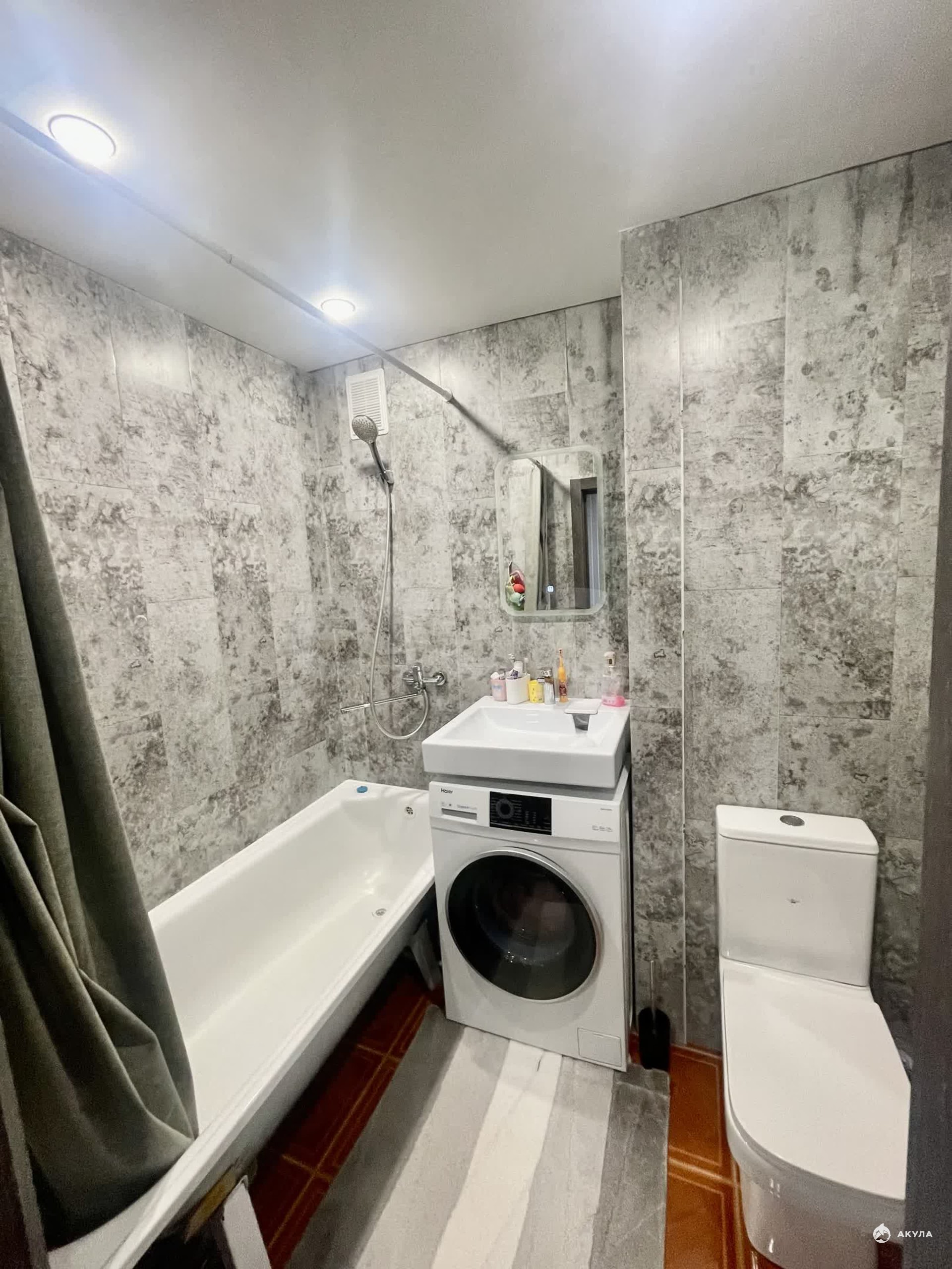 Санузел совмещенный, отделанный пластиковыми панелями.