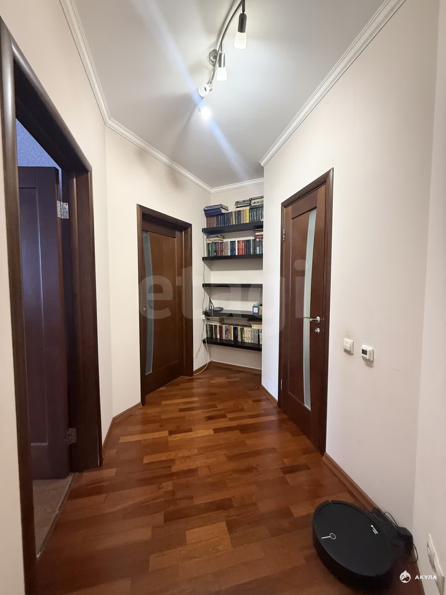 Жилая комната площадью 28 кв.м с полом из пробки и большим встроенным зеркальным шкафом. Просторная прихожая с промежуточной дверью, которая обеспечивает отличную звукоизоляцию от шума в подъезде. Рядом с входной дверью из подъезда есть теплая кладовая площадью 6 кв.м с полками для хранения.