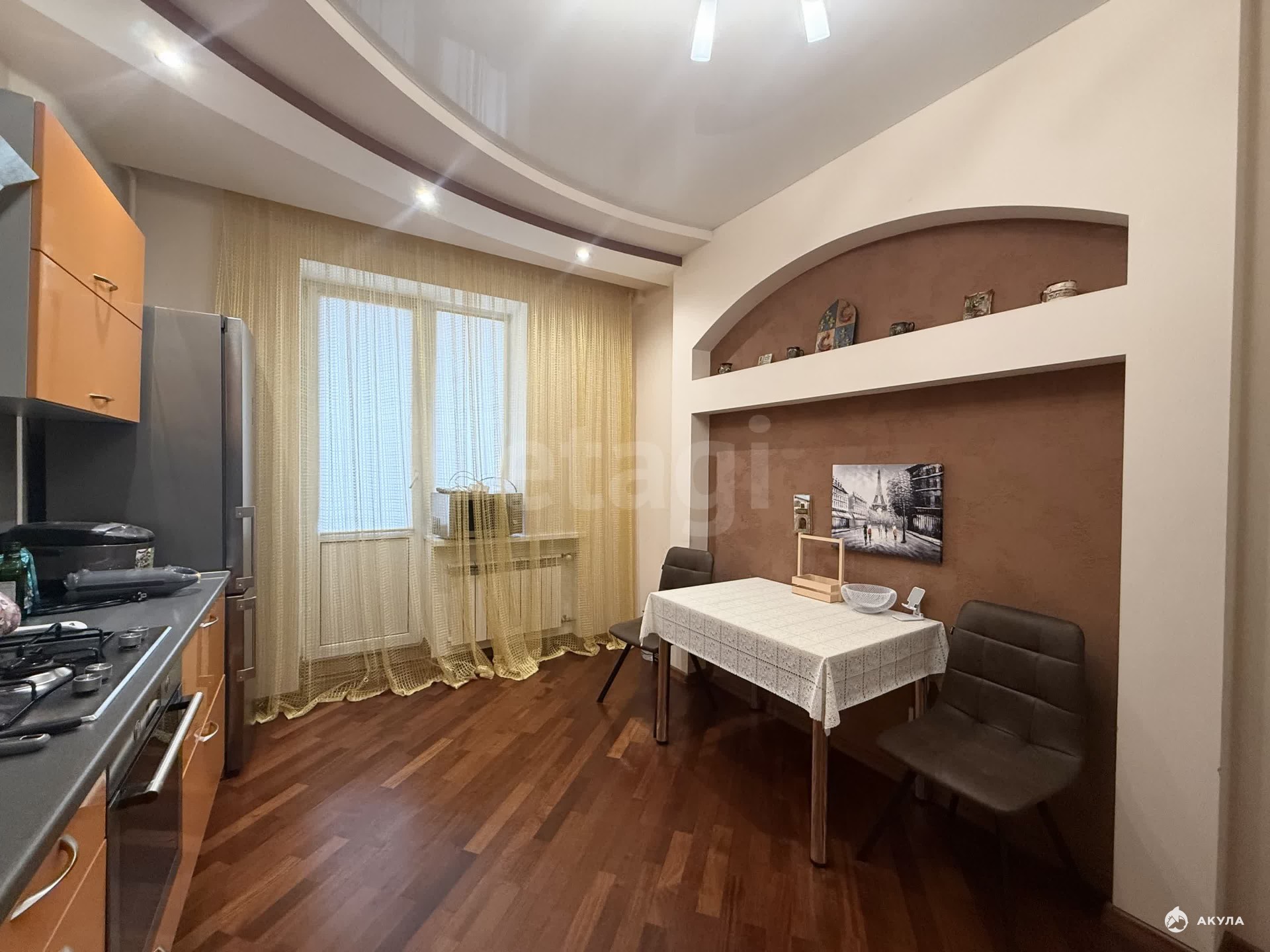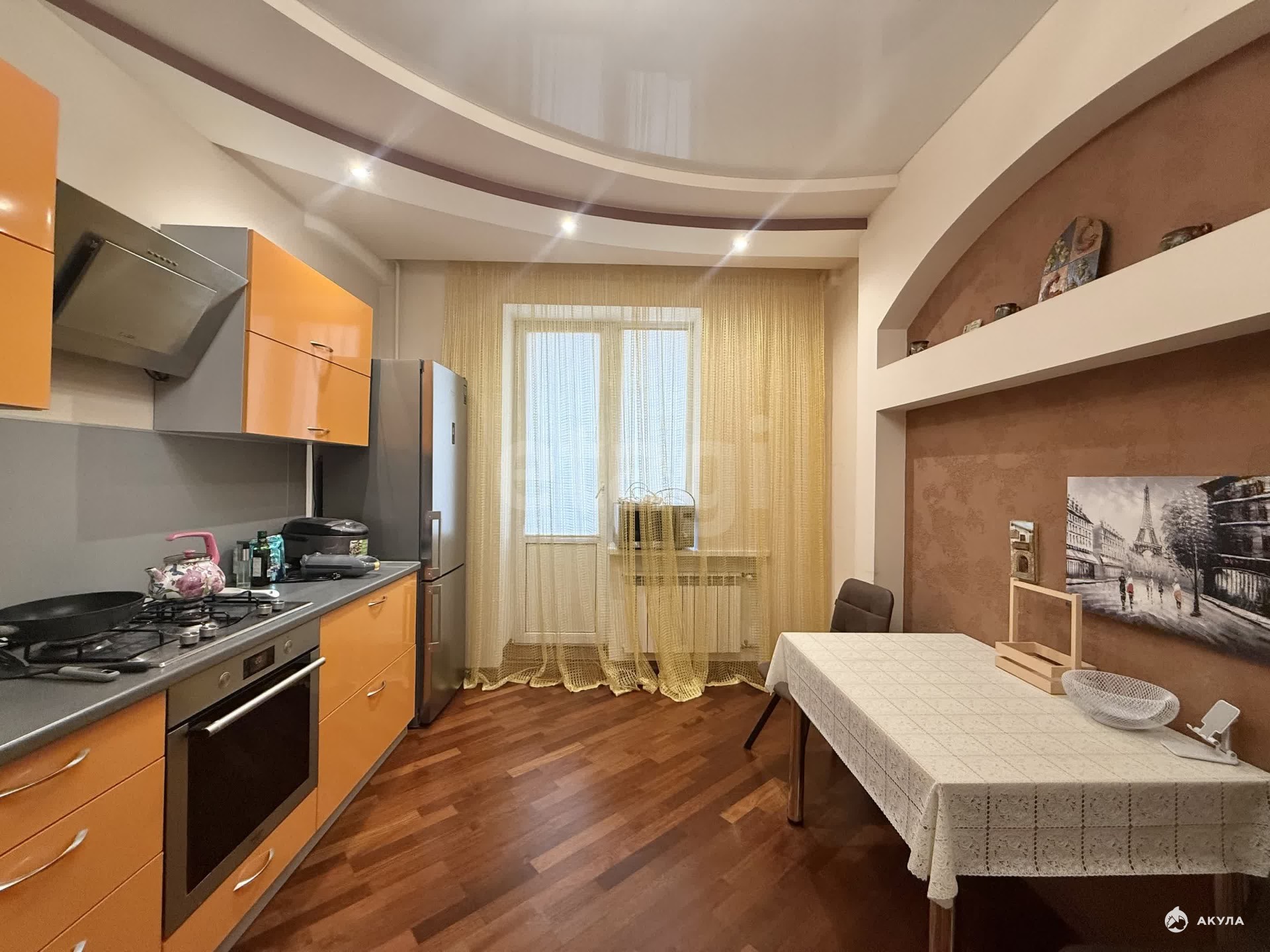 · Кухня 13 м² с паркетной доской из красного дерева, выход на лоджию (отделка — керамогранит + натуральное дерево).