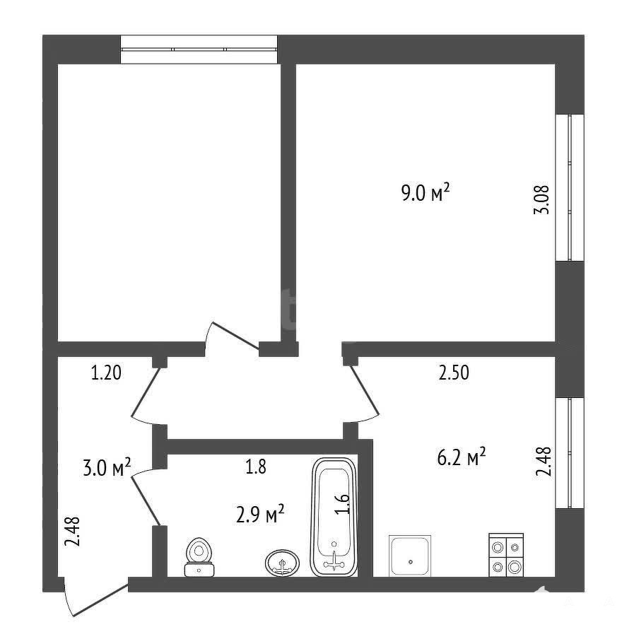 Общая площадь — 30, 6 кв. м, кухня 6, 2 кв. м.