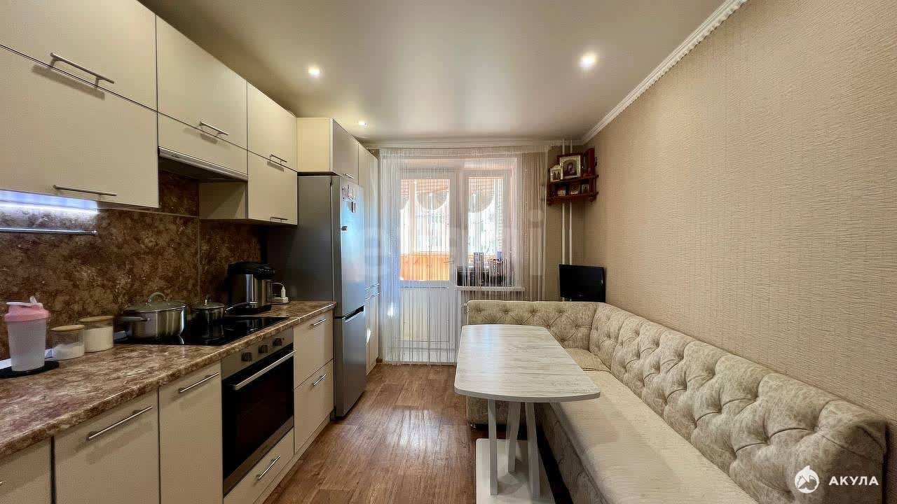 Кухня: 12, 8 кв. м с выходом на балкон, который застеклён, утеплён, обшит вагонкой. Полностью остаётся кухонный гарнитур, обеденный стол и стулья, диван.
