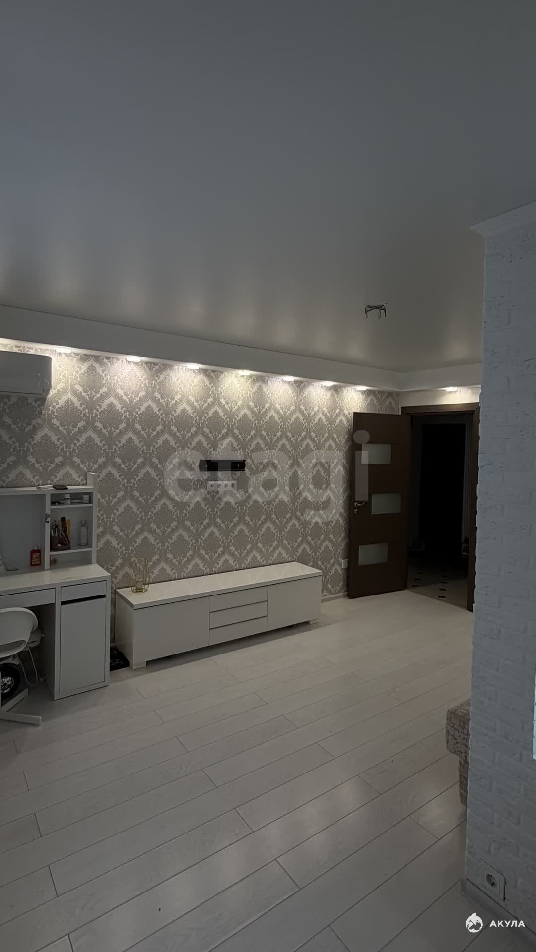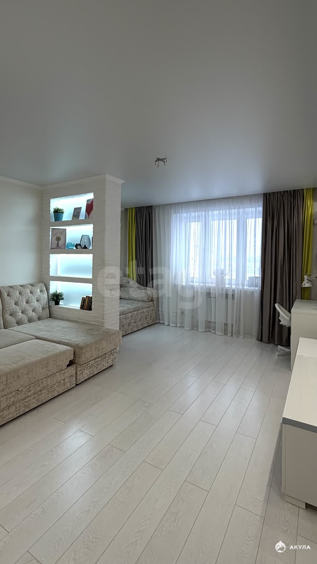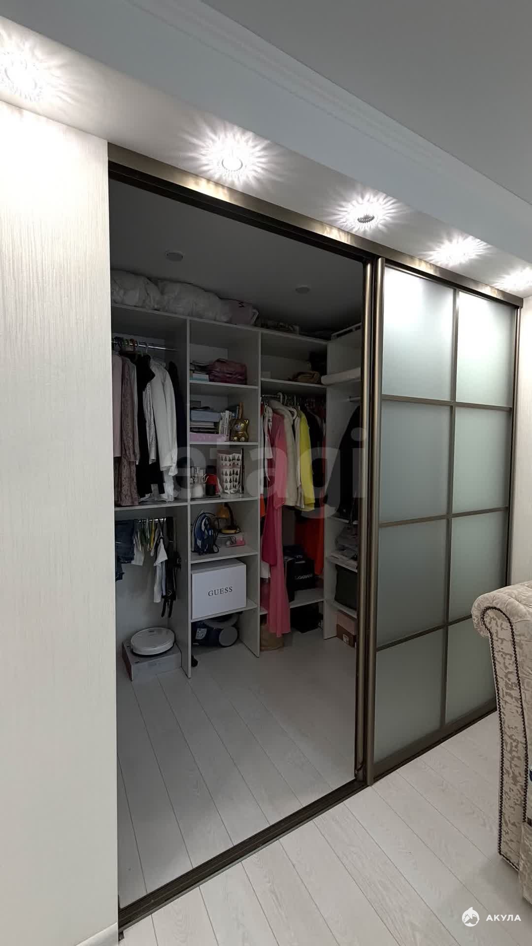 Просторная комната правильной формы площадью 19, 5 м² имеет практичное напольное покрытие, натяжной двухуровневый потолок, кондиционер и удобную гардеробную с продуманной системой хранения.