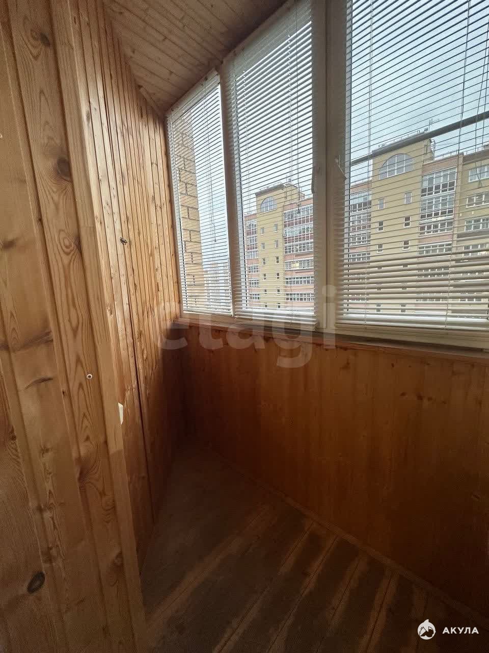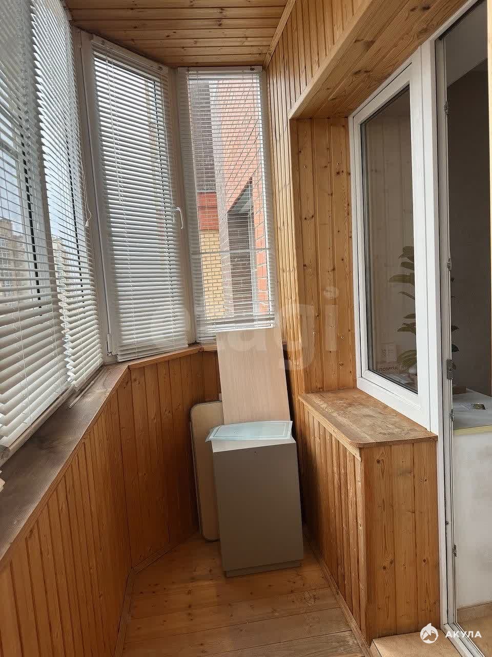 Балкон застеклен, обшит евровагонкой, оборудован встроенный шкаф для хранения.