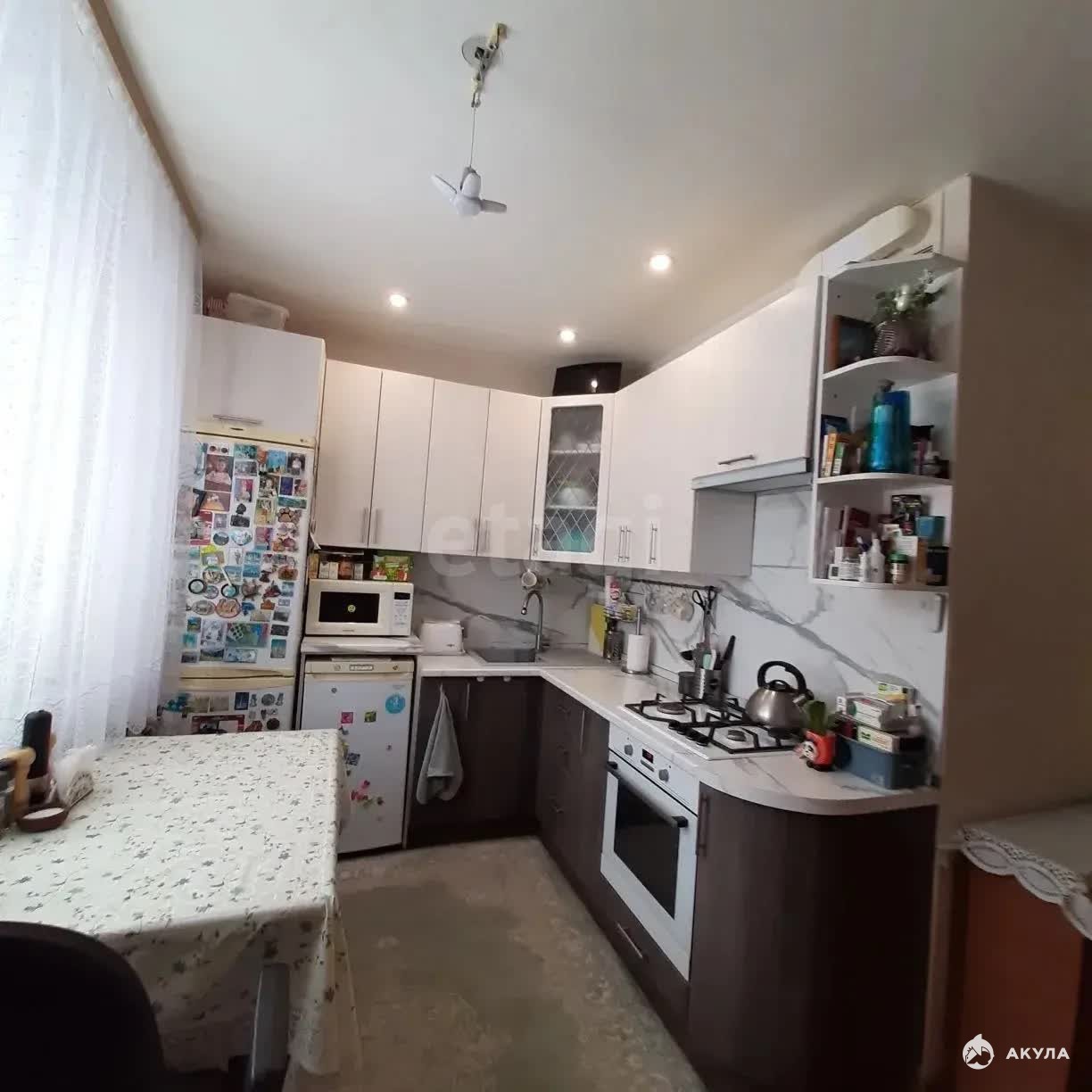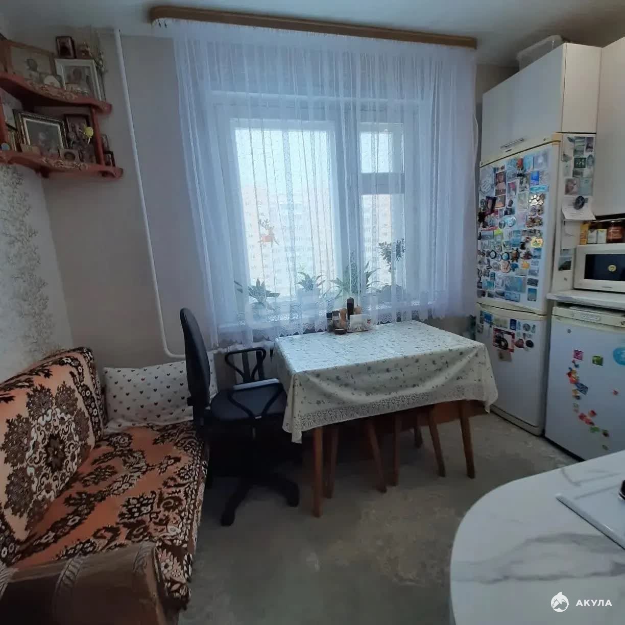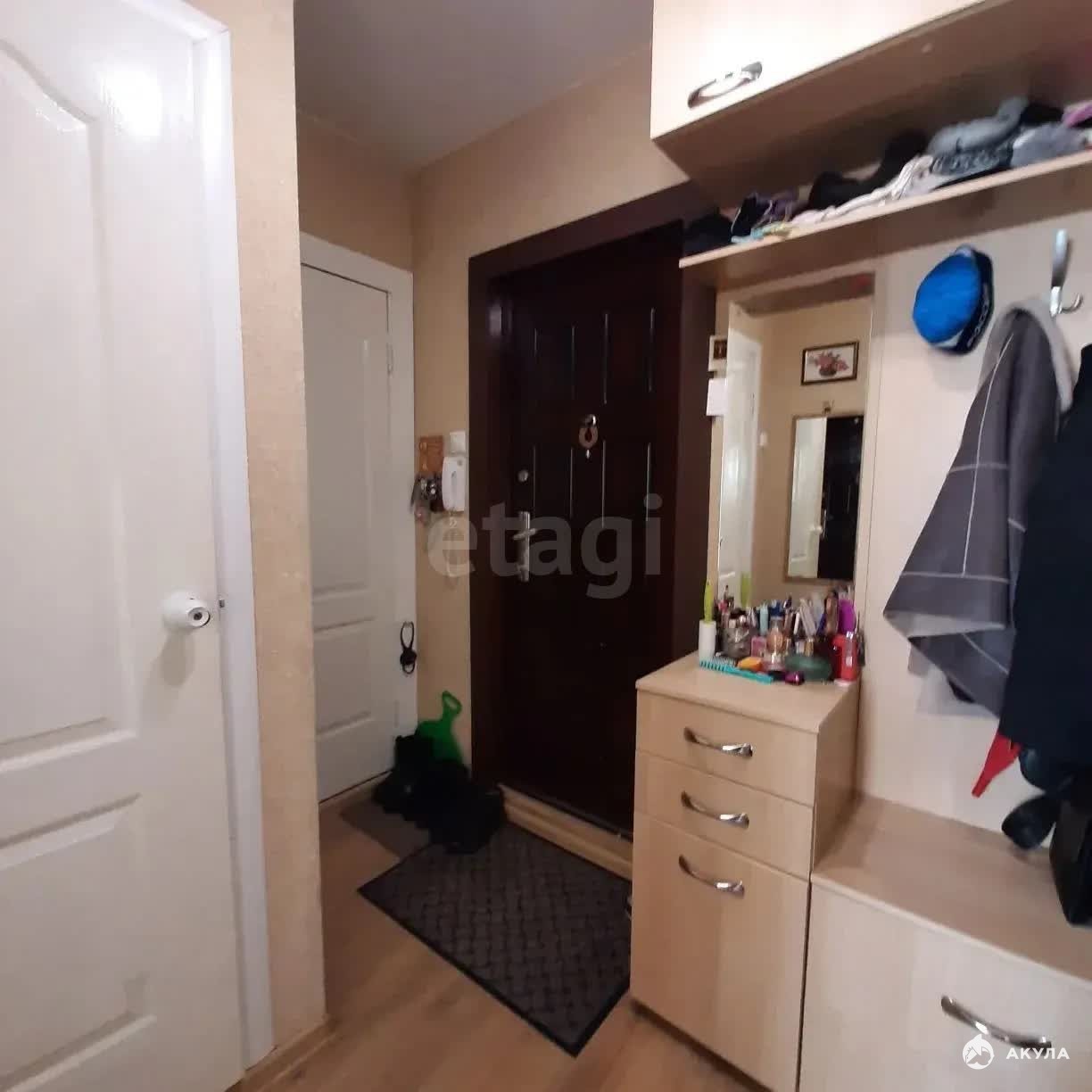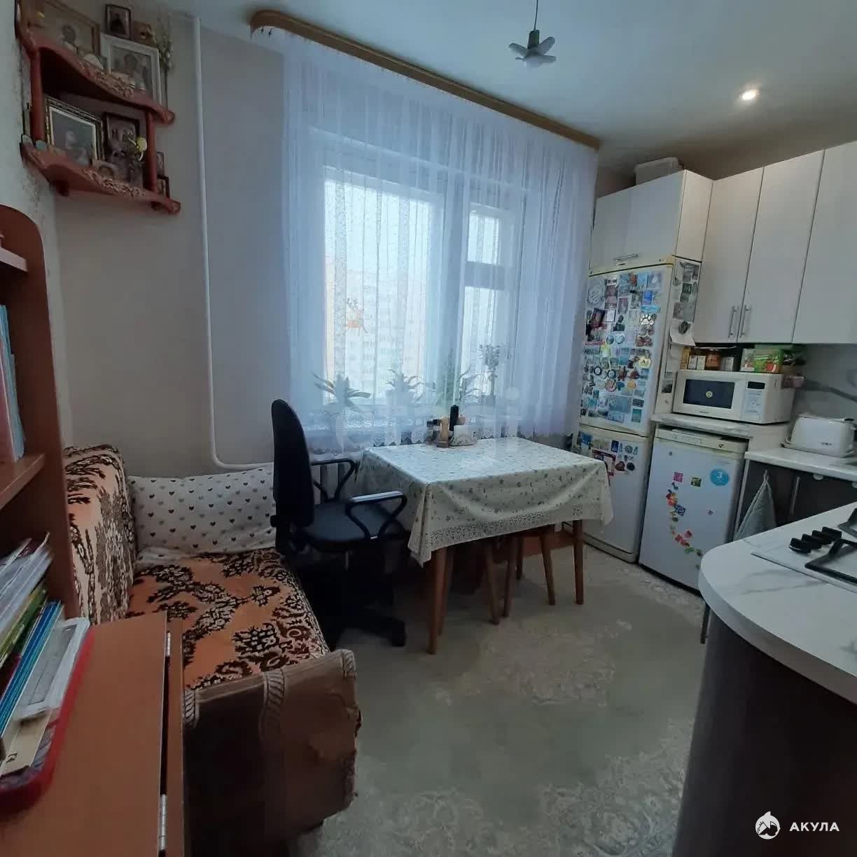 Планировка включает совмещённый санузел с современной отделкой в серых тонах, просторную кухню с газовой плитой, электродуховкой и новой мебелью. В кухне и прихожей установлены натяжные потолки, а в прихожей обустроены удобные полки и кладовая для хранения. В доме работает пассажирский лифт.