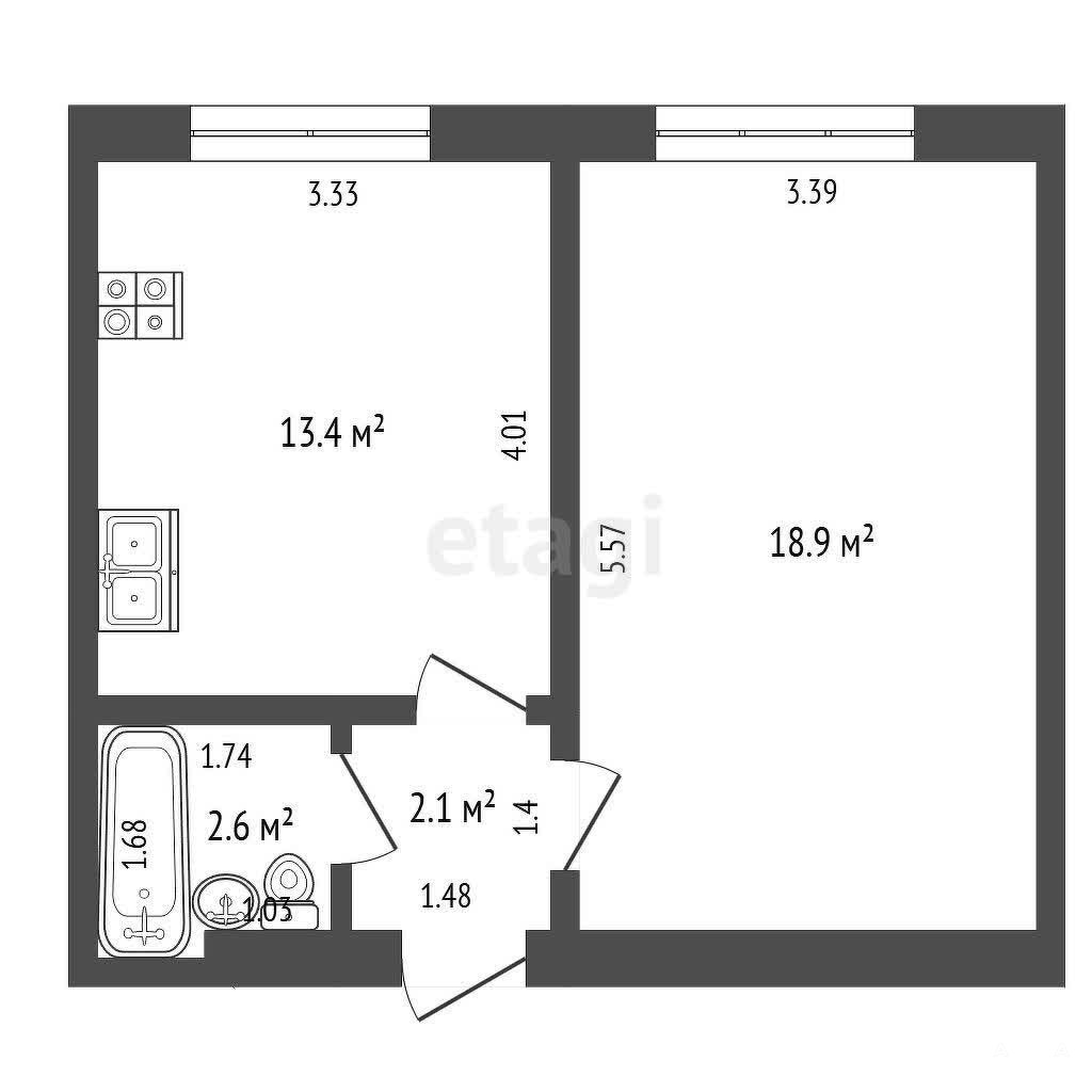 Ключевым преимуществом объекта является его удачная планировка с просторной кухней 13.4 кв. м, что создает комфортное пространство для жизни и приема гостей. Квартира находится в хорошем состоянии: выполнен аккуратный косметический ремонт, стены выровнены и оклеены светлыми обоями, полы покрыты практичным линолеумом. Санузел совмещенный, отделан вагонкой.