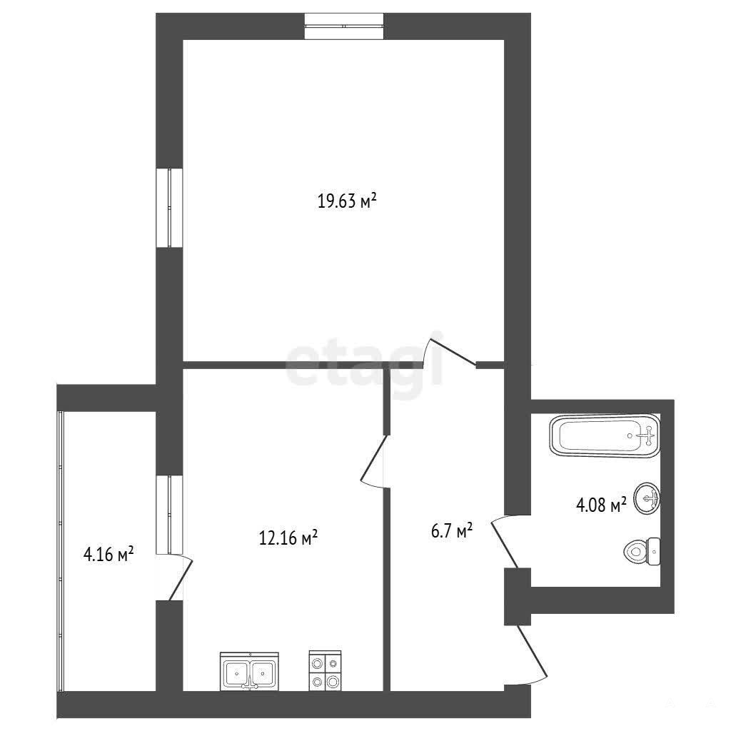 Общая площадь квартиры 46, 73 м² (с учетом лоджии). Жилая площадь комнаты составляет 19, 63 кв. м., площадь кухни — 12, 16 кв. м.