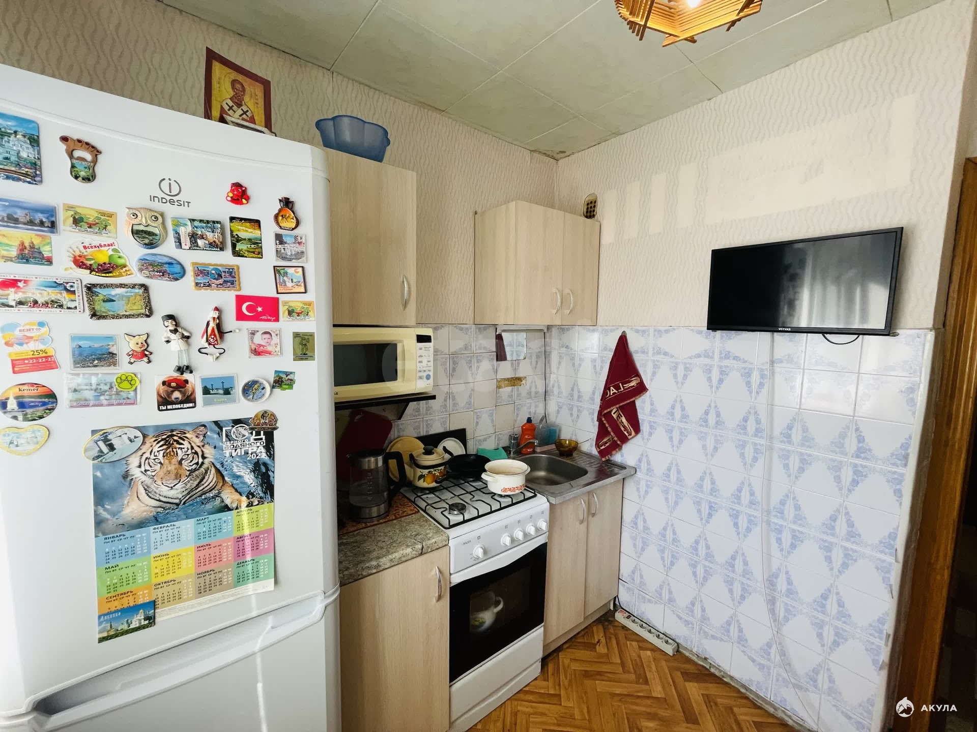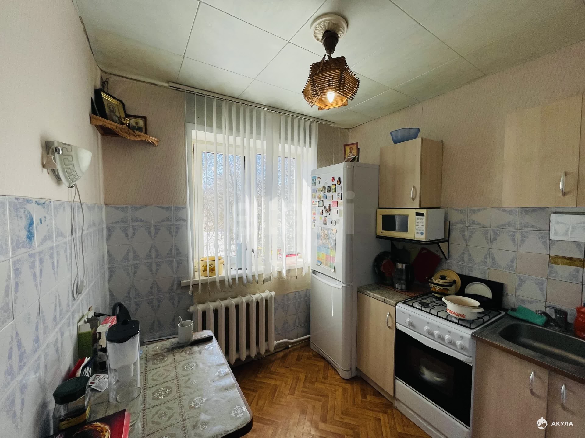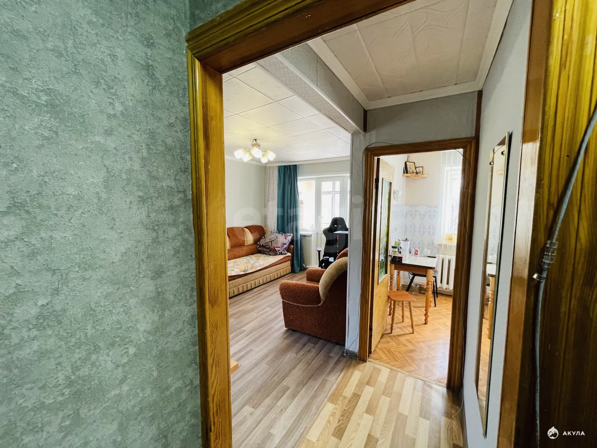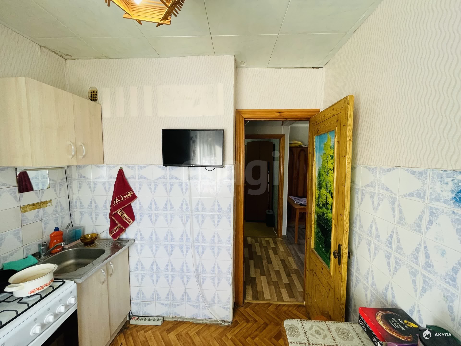 Площадь квартиры 30, 9 кв. м. Кухня 5, 9 кв. м. Комната 19, 2 кв. Ремонт косметический, на полу линолеум, на потолке панели, окна пластиковые, трубы все заменены. Санузел совмещён.