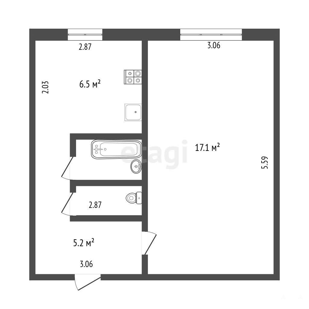 Площадь комнаты 17, 1 кв. м, кухня — 6, 5 кв. м.