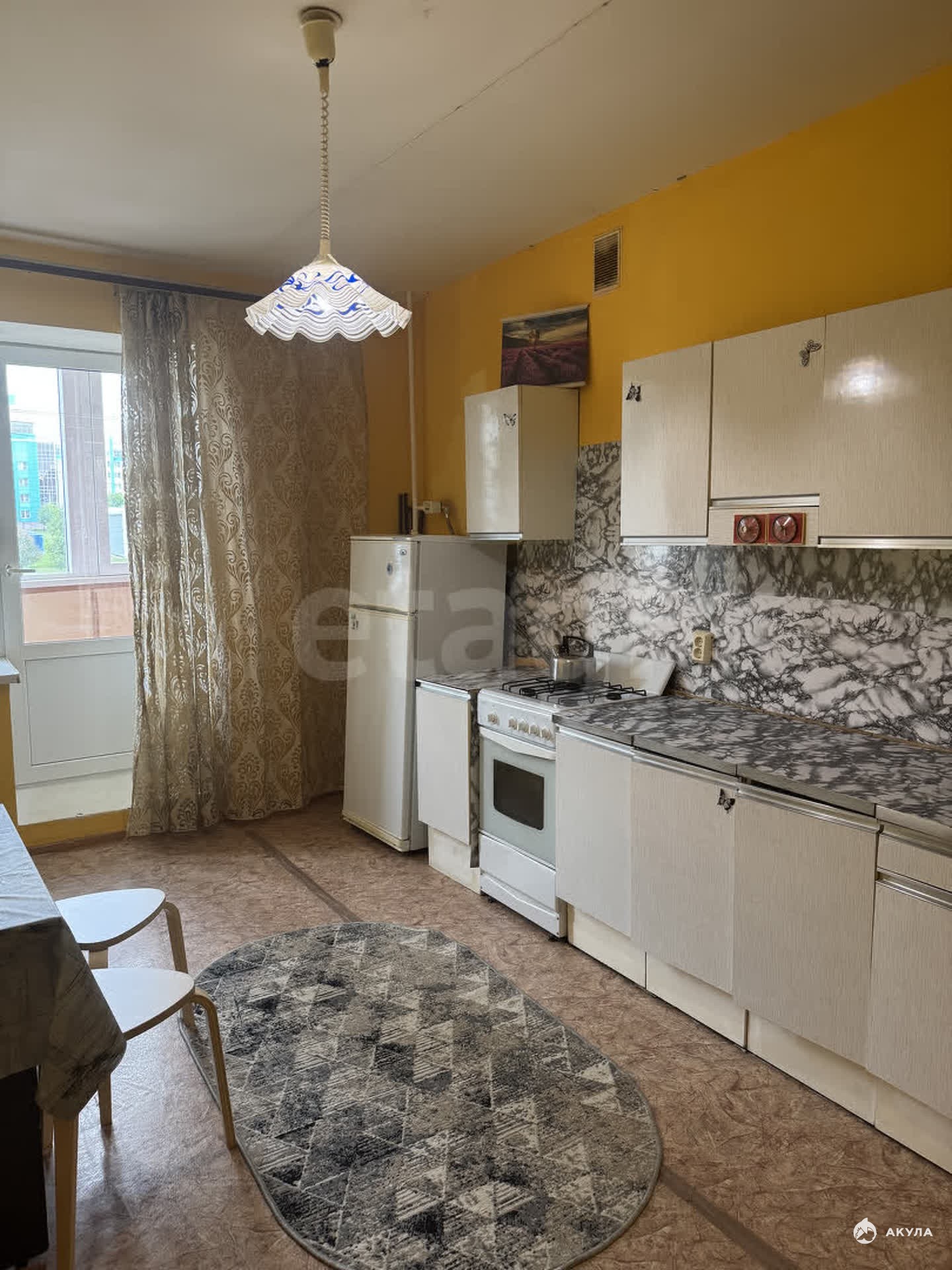 Балкон, установлен стеклопакет. Остаётся кухонный гарнитур, мебель, техника. Имеется кладовая.
