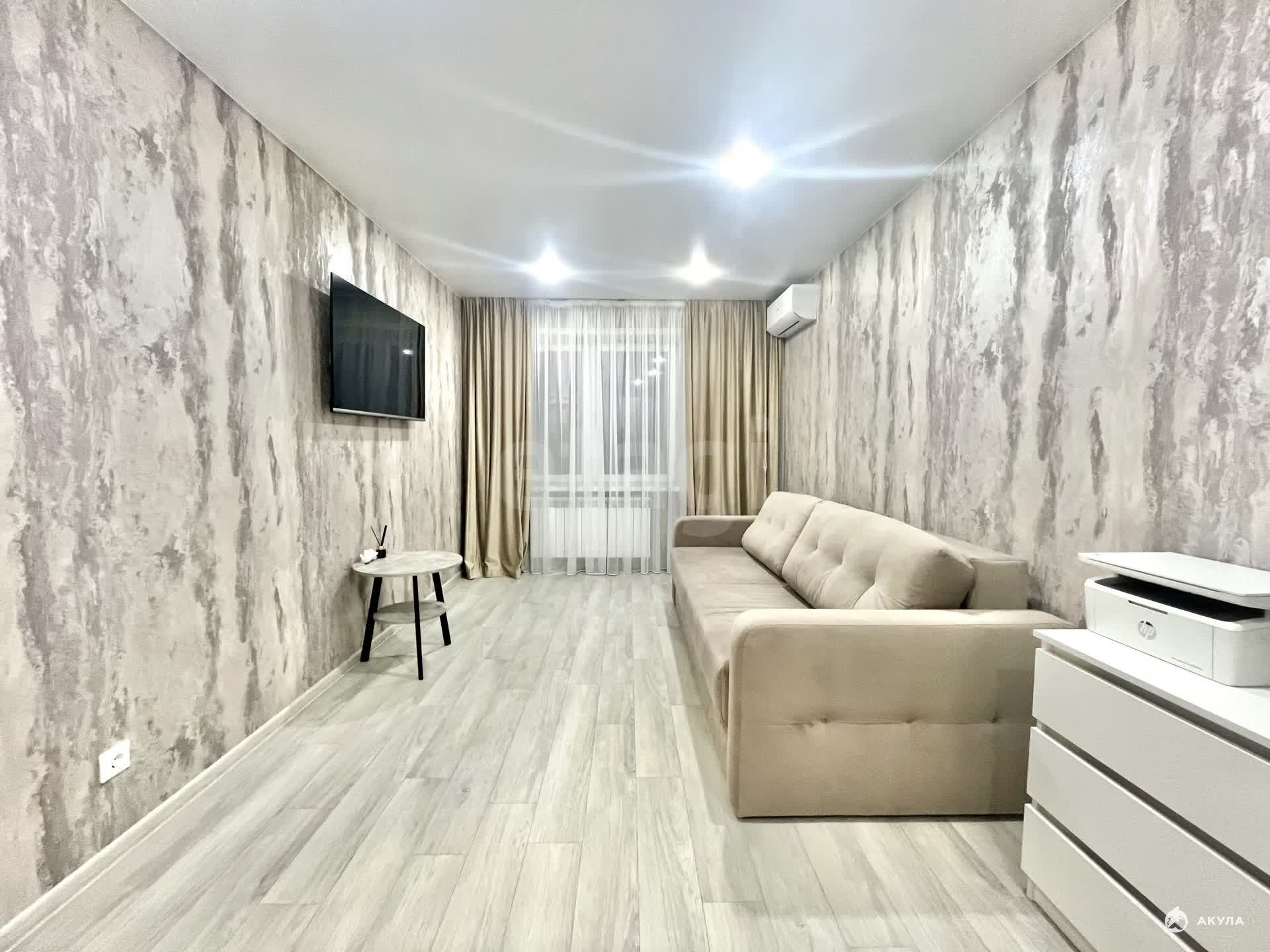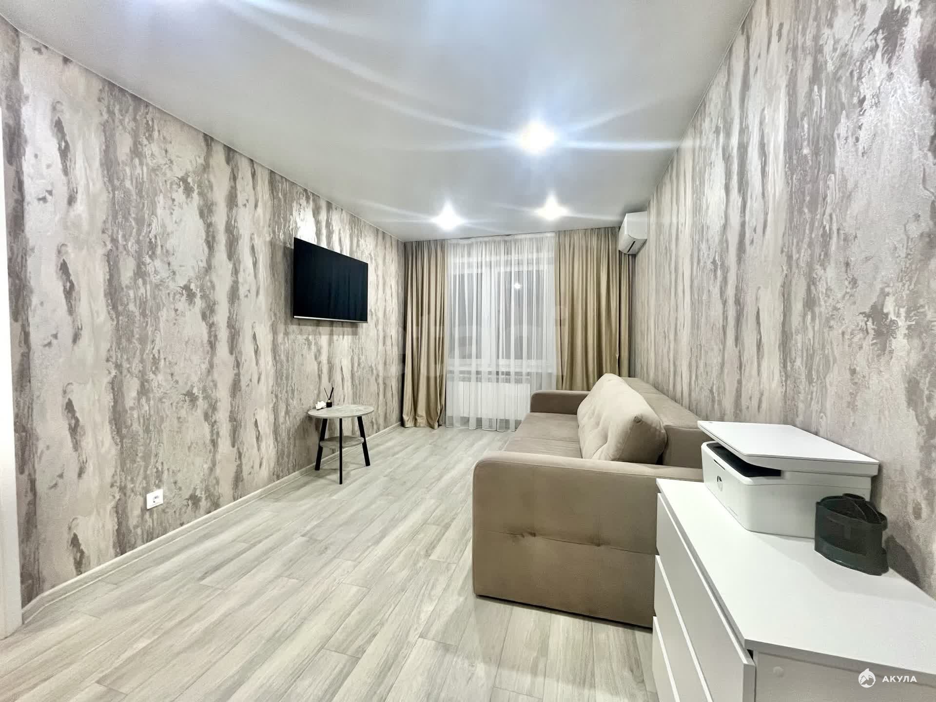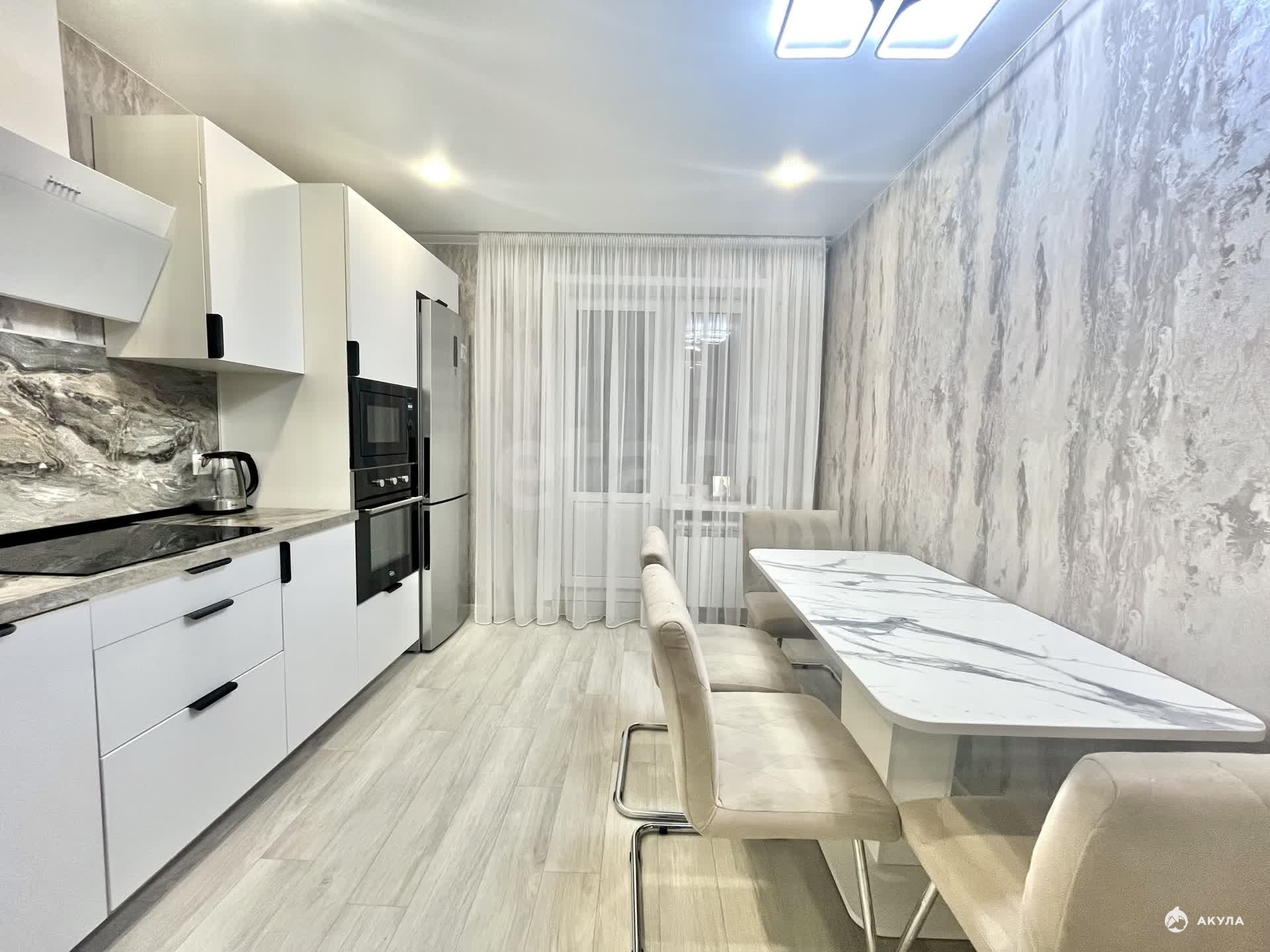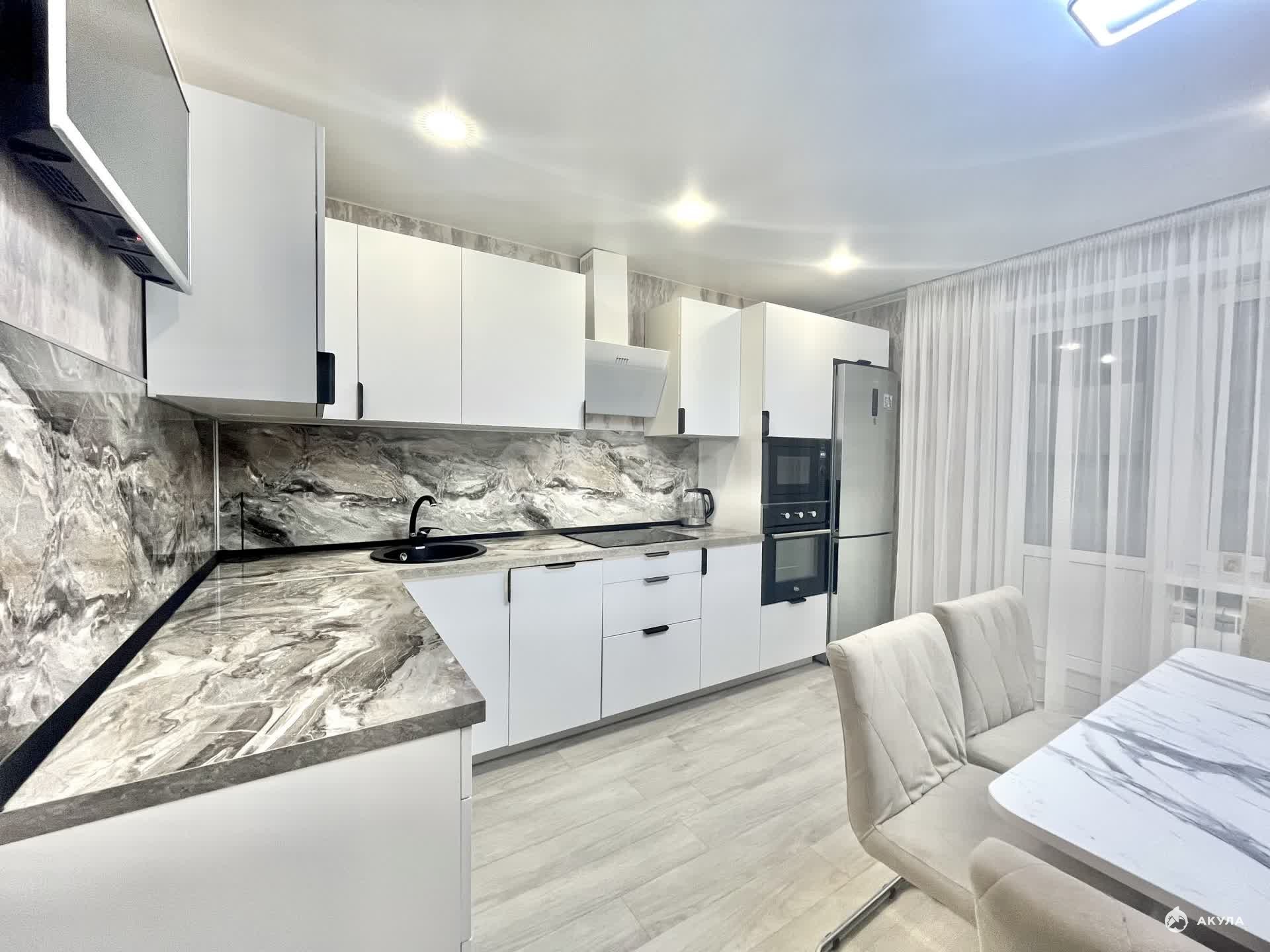 Квартира полностью готова к проживанию: выполнен качественный ремонт в светлых тонах, интерьер оформлен в современном стиле, установлена функциональная кухонная зона с варочной панелью, кондиционер, что создает атмосферу комфорта и уюта.