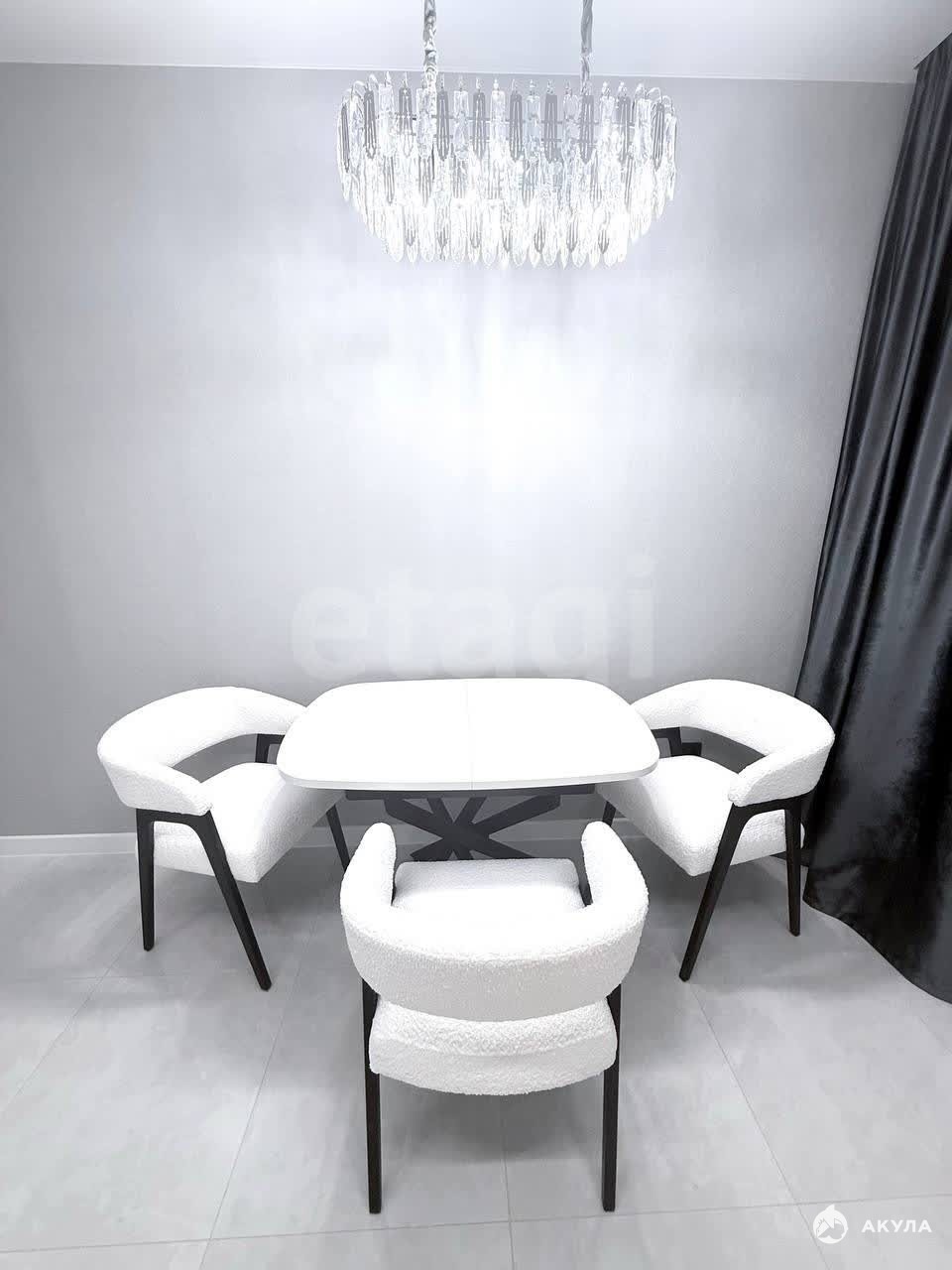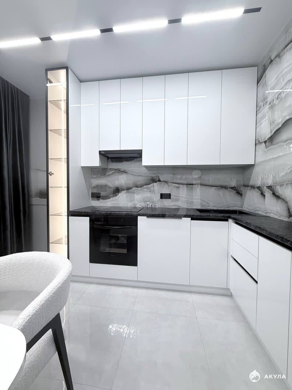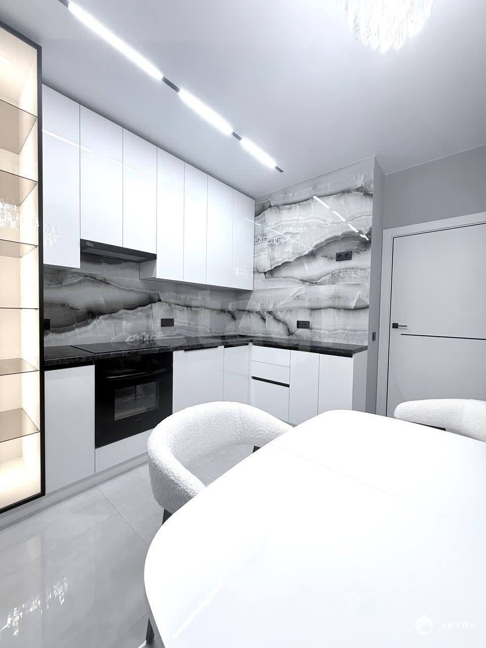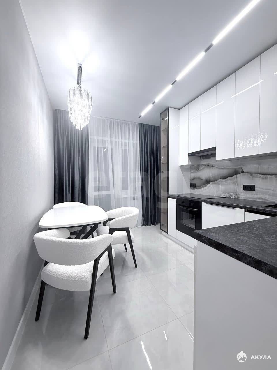 Кухонный гарнитур укомплектован встроенной техникой — варочной панелью, духовым шкафом и вытяжкой, посудомоечной машиной, а также дополнен витриной с подсветкой. Практичным решением стала гардеробная зона в прихожей. Межкомнатные двери с металлической кромкой и магнитными замками. Раздвижной стол, удобные современные стулья.
