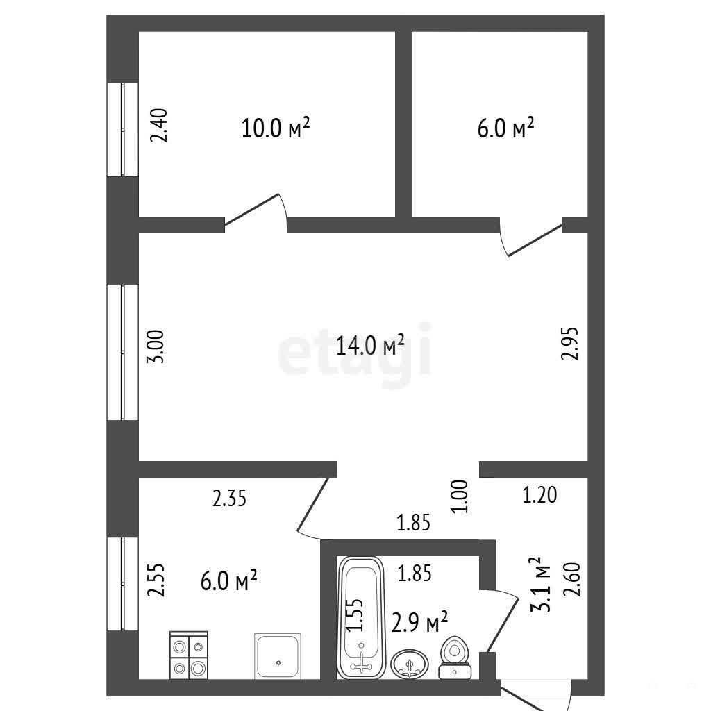 Общая площадь 41, 2 кв. м., находится на 1 этаже 5-этажного кирпичного дома, первая комната 14 кв. м., вторая комната 10 кв. м.,