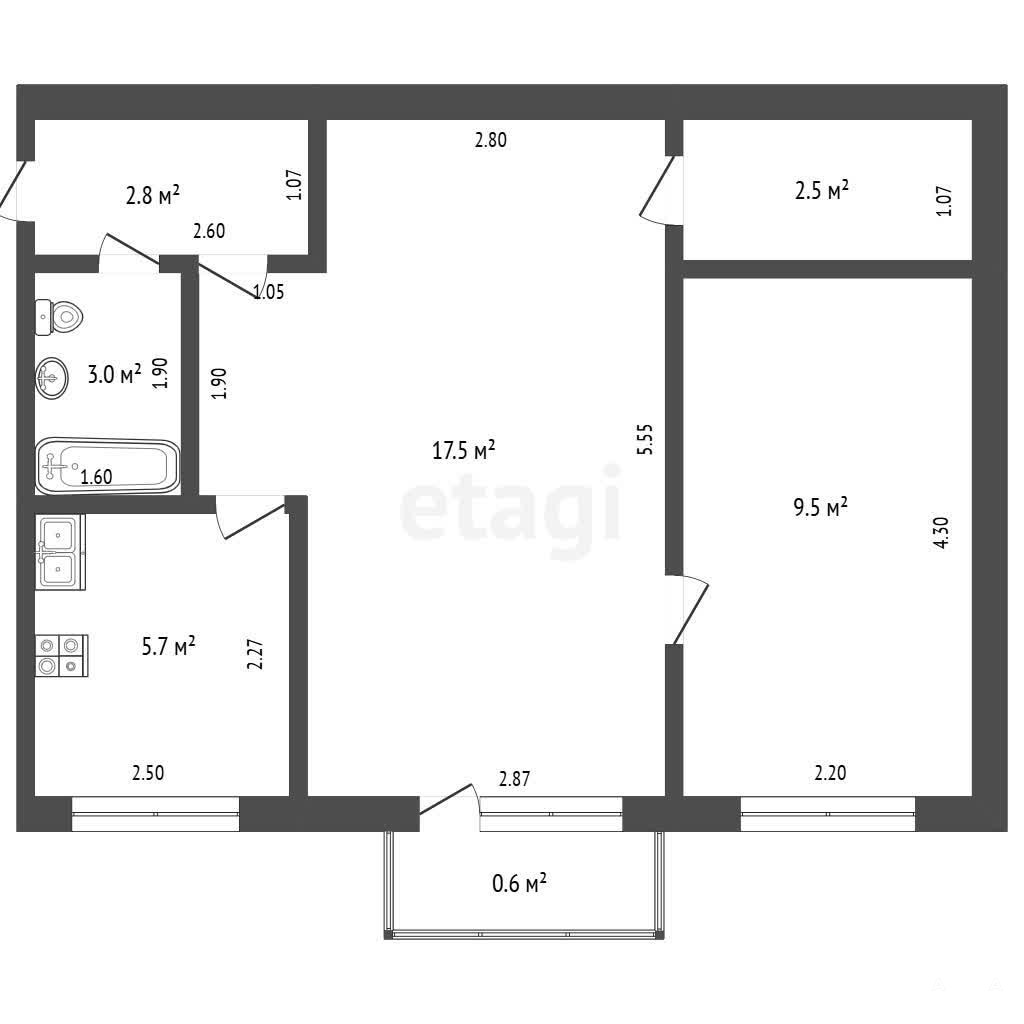 Общая площадь 42, 3 кв. м., находится на 5 этаже 5-этажного кирпичного дома, первая комната 17, 5 кв. м., вторая комната 9, 5 кв. м.,