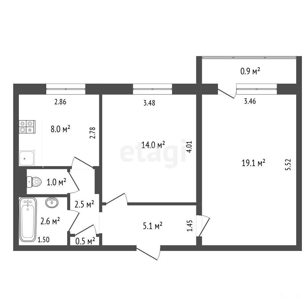 Общая площадь составляет 52, 8 кв.м, идеально распределённая между двумя комнатами площадью 19 и 14 кв.м, кухней размером 8 кв.м. Интерьер выполнен в современном стиле, благодаря чему квартира выглядит стильно и современно.