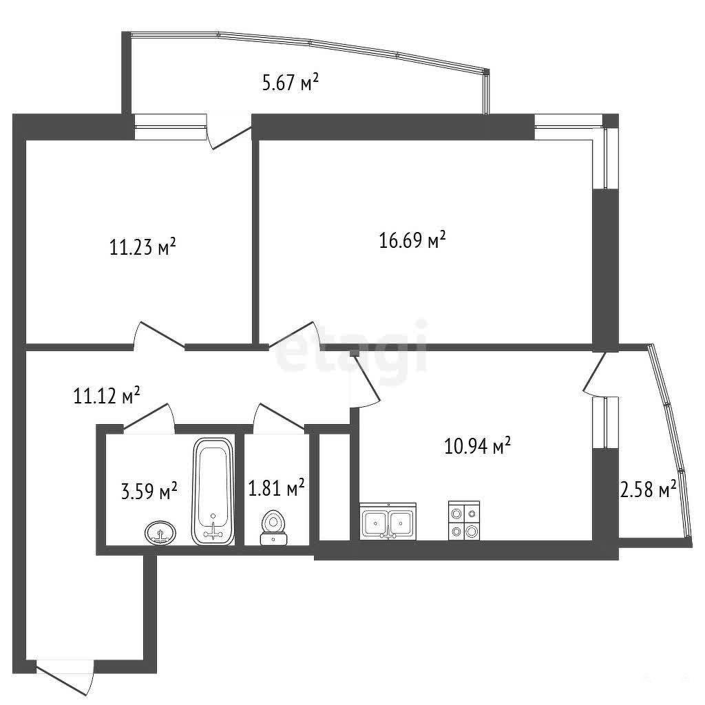 Планировка отличается практичностью: просторная кухня площадью 10, 94 кв. м с выходом на балкон и две изолированные комнаты 16, 69 кв. м и 11, 23 кв. м с выходом на другой большой балкон площадью 5, 67 кв. м.