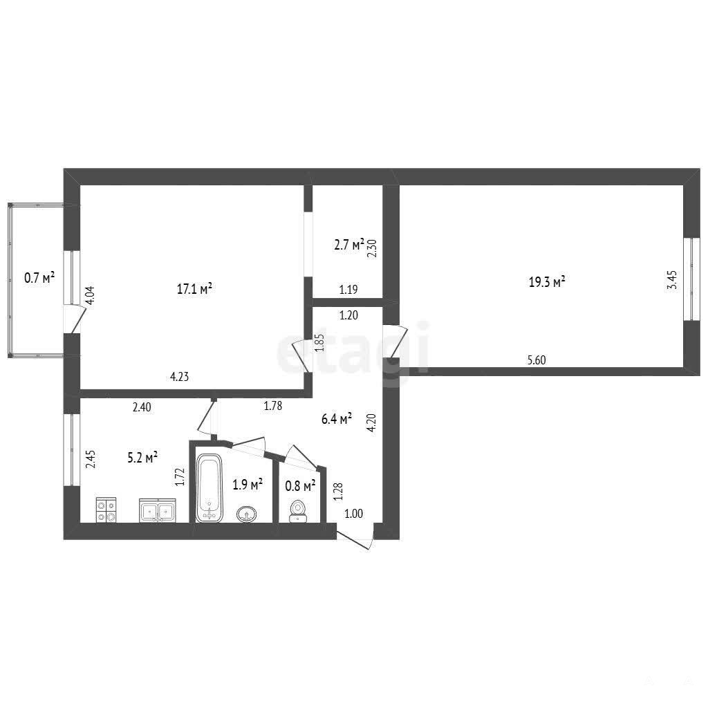 Планировка включает просторные раздельные комнаты площадью 17 и 19 м², кухню размером 5 м². Благодаря удачной расстановке комнат каждый сможет наслаждаться личным пространством и тишиной.
