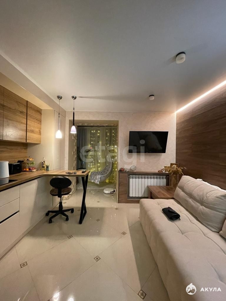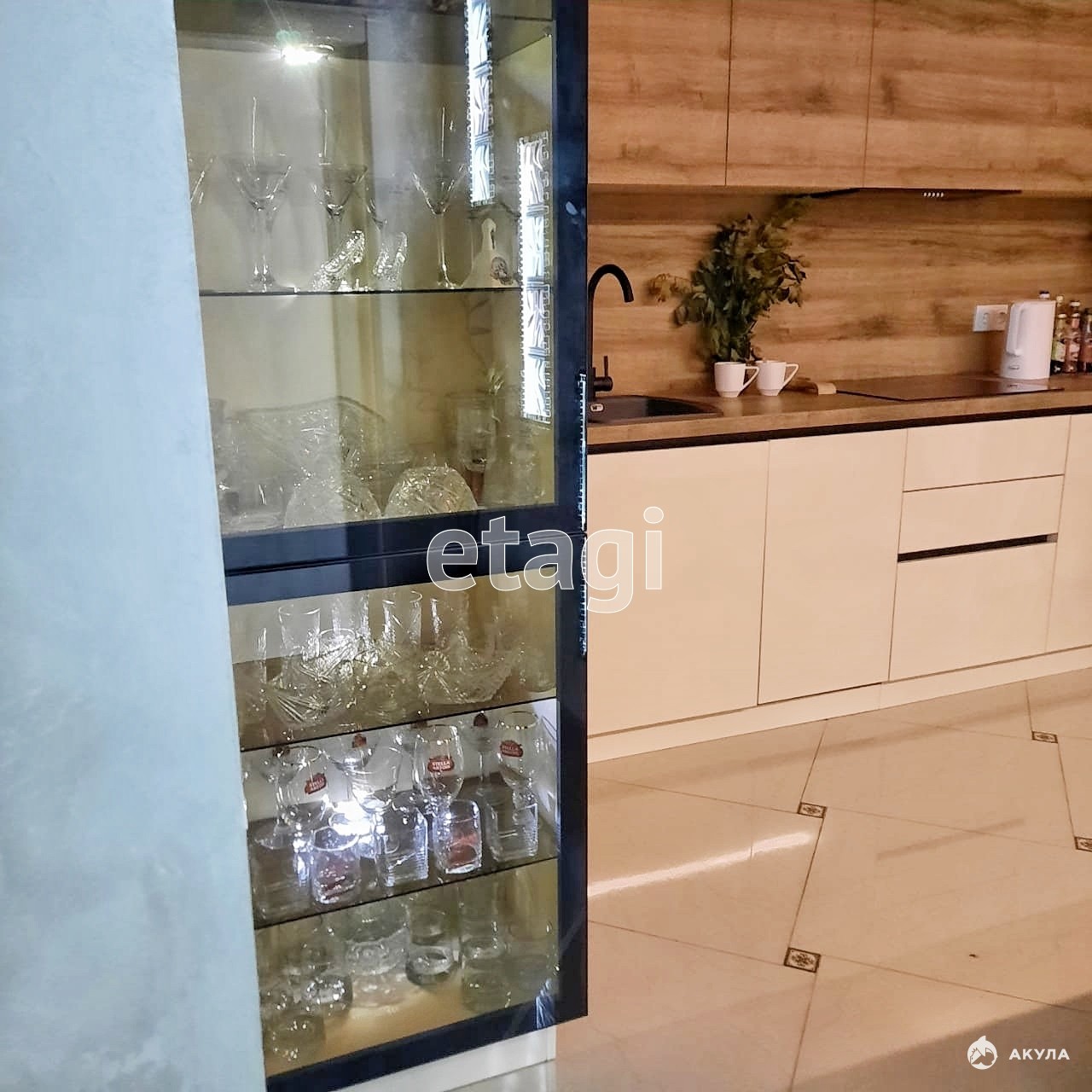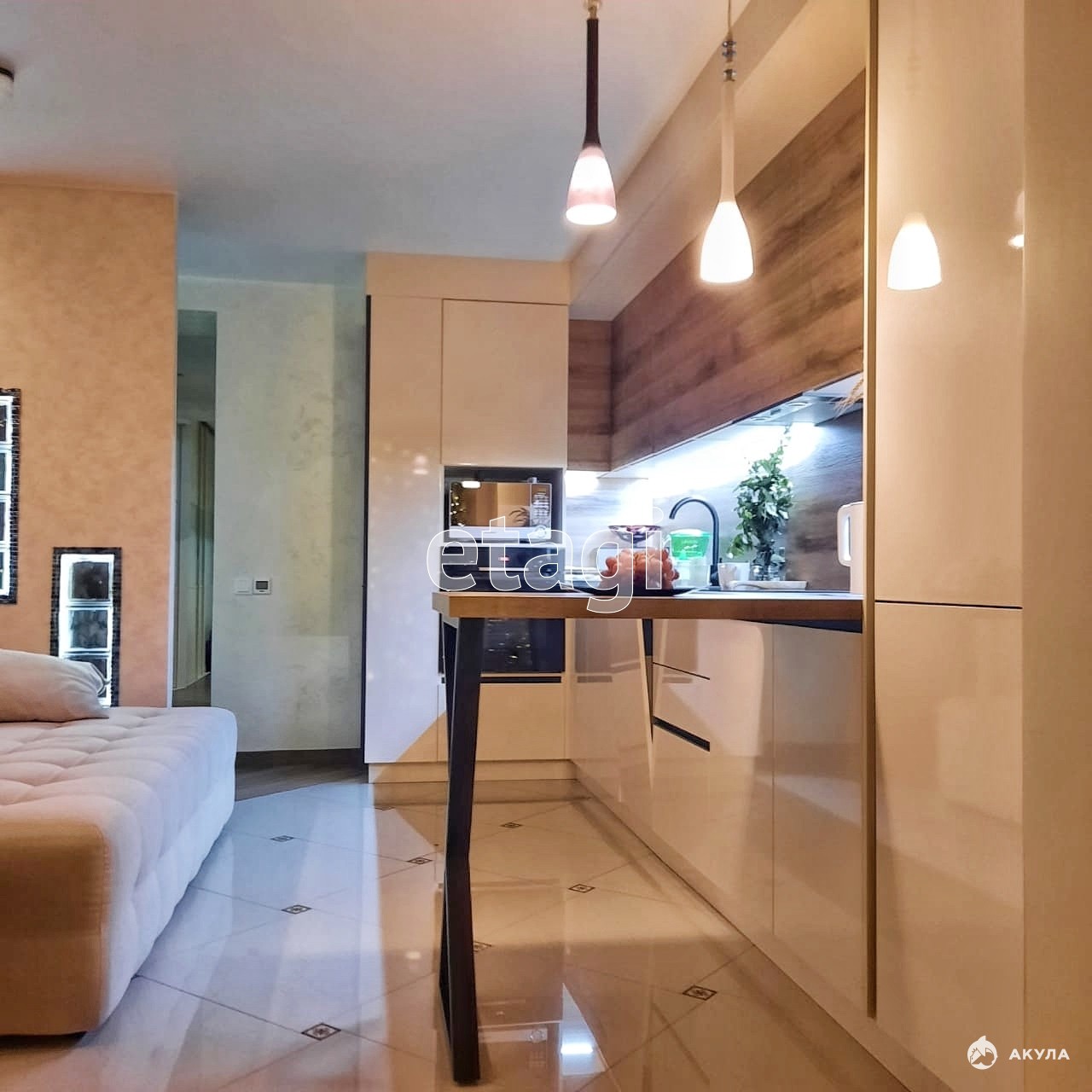 В квартире сделан очень качественный современный ремонт. Напольное покрытие на кухне — кафель, теплый пол. Потолок — натяжной. Кухонный гарнитур очень качественный и дорогой.