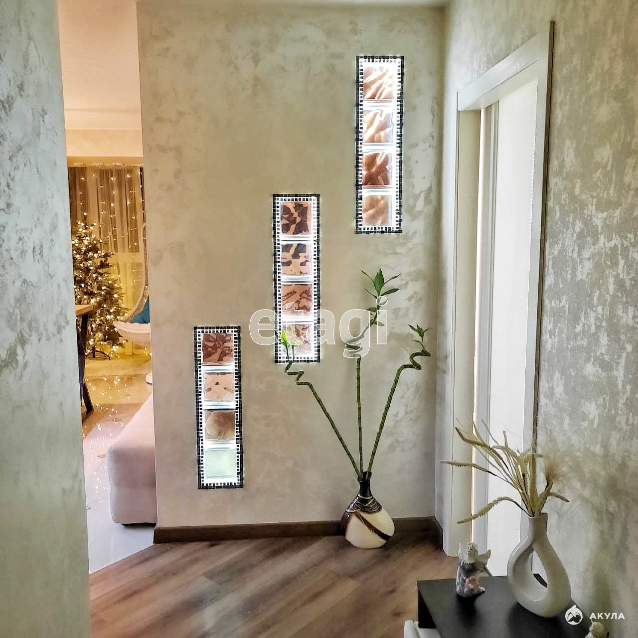 Во входной зоне и комнатах — ламинат. Установлена гардеробная система. Натяжные потолки по всей площади квартиры. Все балконы объединены с комнатами, установлены панорамные окна. Выделена рабочая зона и зона отдыха.