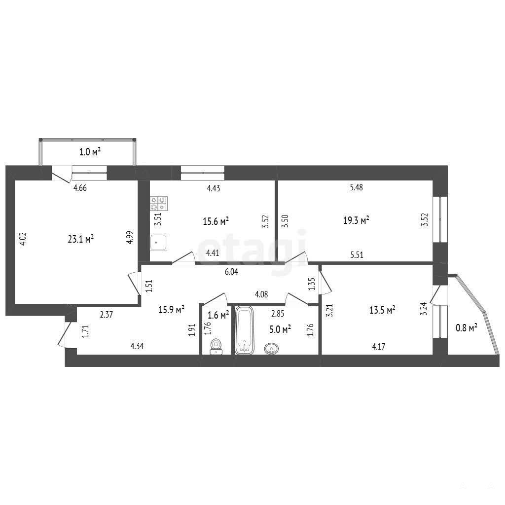 - Планировка: общая площадь составляет 94 квадратных метра, включает кухню-гостиную размером 23, 1 кв. м., три изолированные комнаты общей площадью около 48, 4 кв. м.: две большие спальни по 19, 3 и 15, 6 кв. м., а также меньшая комната площадью 13, 5 кв. м.