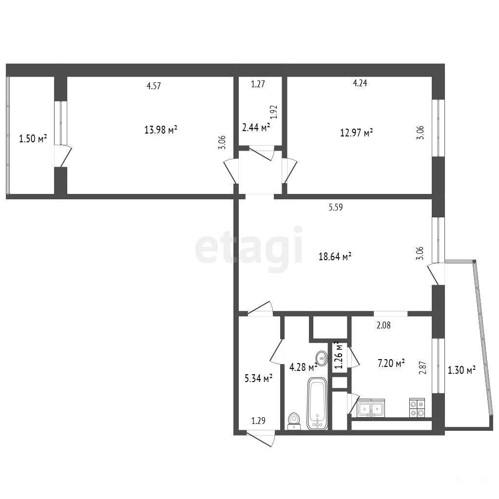 Две изолированные комнаты, зал проходной. Сделана перепланировка квартиры. Кухня 7, 2 м.кв. и ванная увеличены. Санузел совмещен.