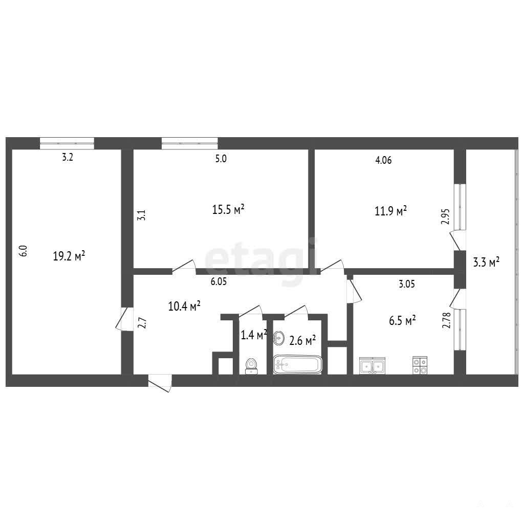 Выполнен косметический ремонт, раздельный санузел. Напольное покрытие — керамогранит и линолеум. Три изолированные комнаты площадью 11, 9 м², 15, 5 м² и 19, 2 м². Из кухни и одной из спален есть выход на застекленную лоджию, обшитую деревянной вагонкой, что создает дополнительную зону для отдыха или хранения.