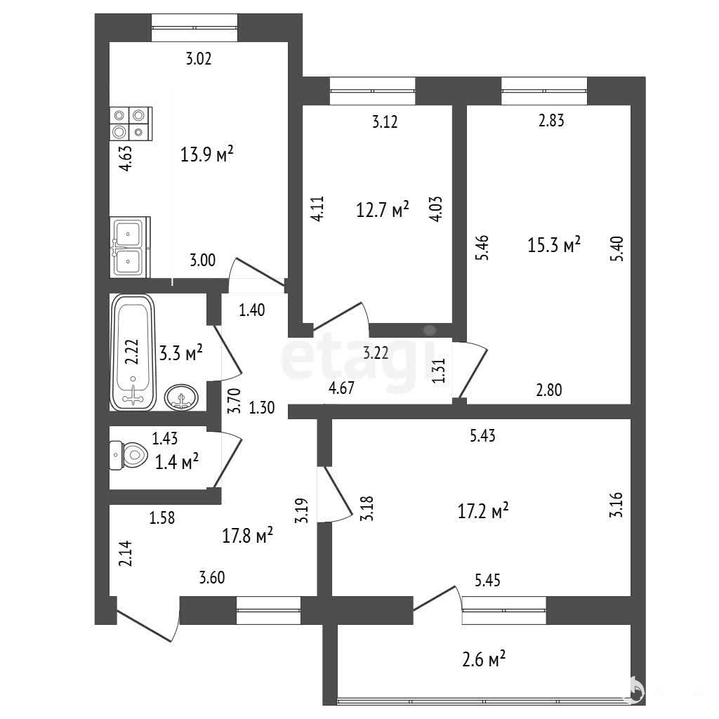 Квартира включает три изолированные комнаты (12, 7 м², 15, 3 м² и 17, 2 м²), что позволяет легко организовать уютную гостиную, спальни и кабинет. Просторный зал с выходом на большой балкон площадью 2, 6 м² — идеальное место для утреннего кофе или отдыха на свежем воздухе. Раздельный санузел облицован качественной плиткой, что подчеркивает современный стиль и удобство.