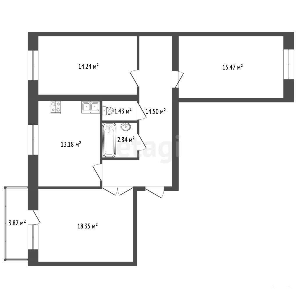 Ее ключевое преимущество — рациональная планировка с изолированными комнатами площадью 18, 35 / 14, 24 / 15, 47 кв. м, что обеспечивает уединенность для всех жильцов.
