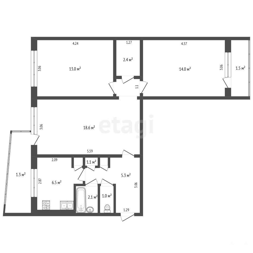 Площадь квартиры 64 кв.м. Комнаты 18.6, 14, 13 кв.м. Кухня 6.5 кв.м. Коридор 5.3 кв.м. Сан узел раздельный. Есть балкон и лоджия, застеклены, просторная кладовая.