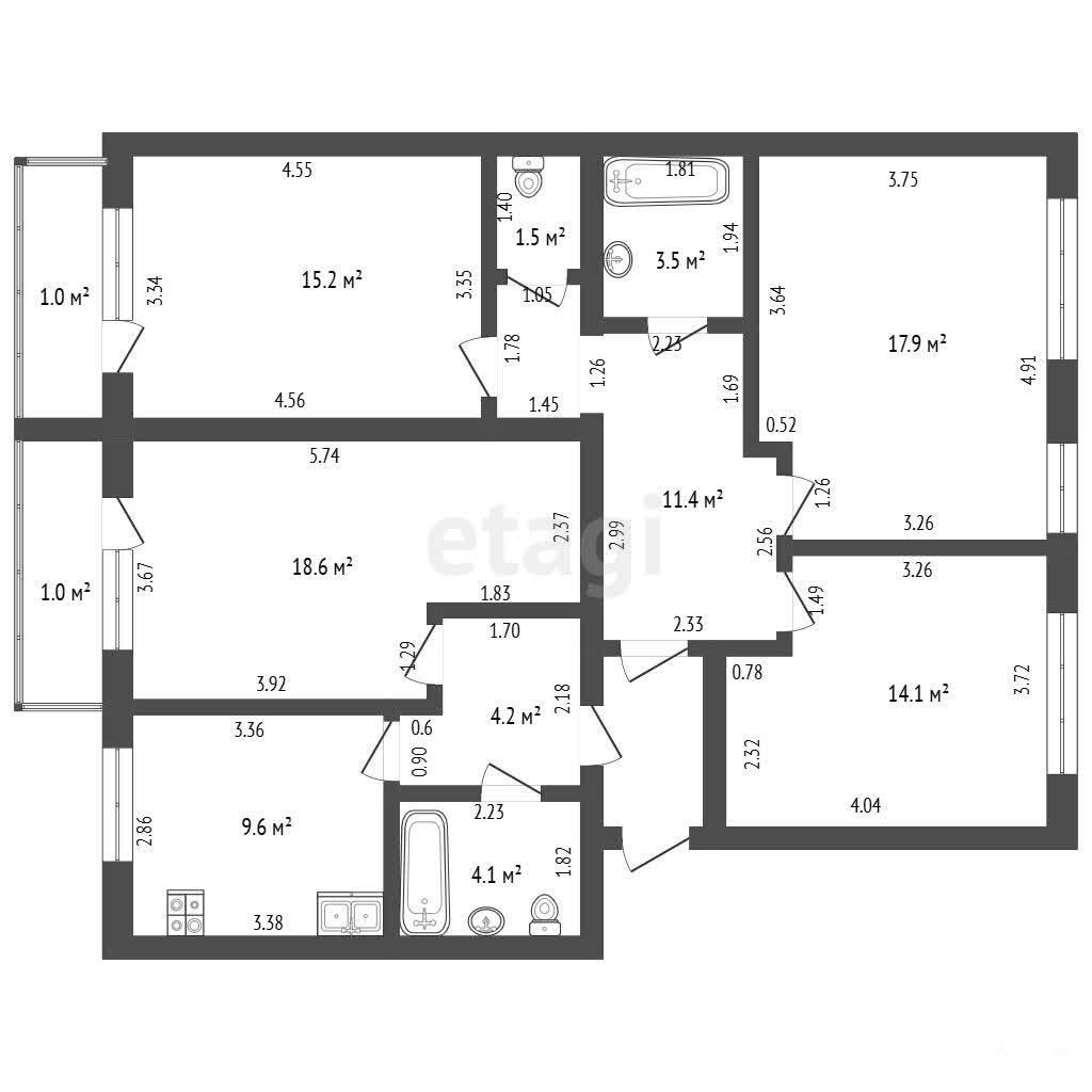 Площади комнат: 14, 1 м², 17, 9 м², 15, 2 м², 18, 6 м², 9, 6 м². Коридор 20 м². Две лоджии. Пол в кафеле и современном линолеуме. Две лоджии. Очень высокий первый этаж. Лоджии во двор, там нет тротуаров, прохожие не ходят. В хорошем состоянии коммуникации.