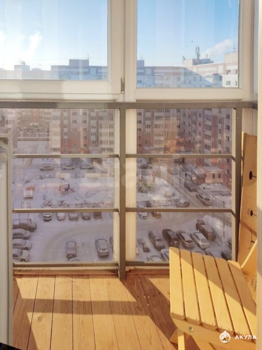 Ключевой особенностью является просторный балкон с панорамным остеклением, обеспечивающий обширный вид на городскую панораму; пол балкона дополнительно обшит деревянной вагонкой, создавая уютную и теплую зону для отдыха.