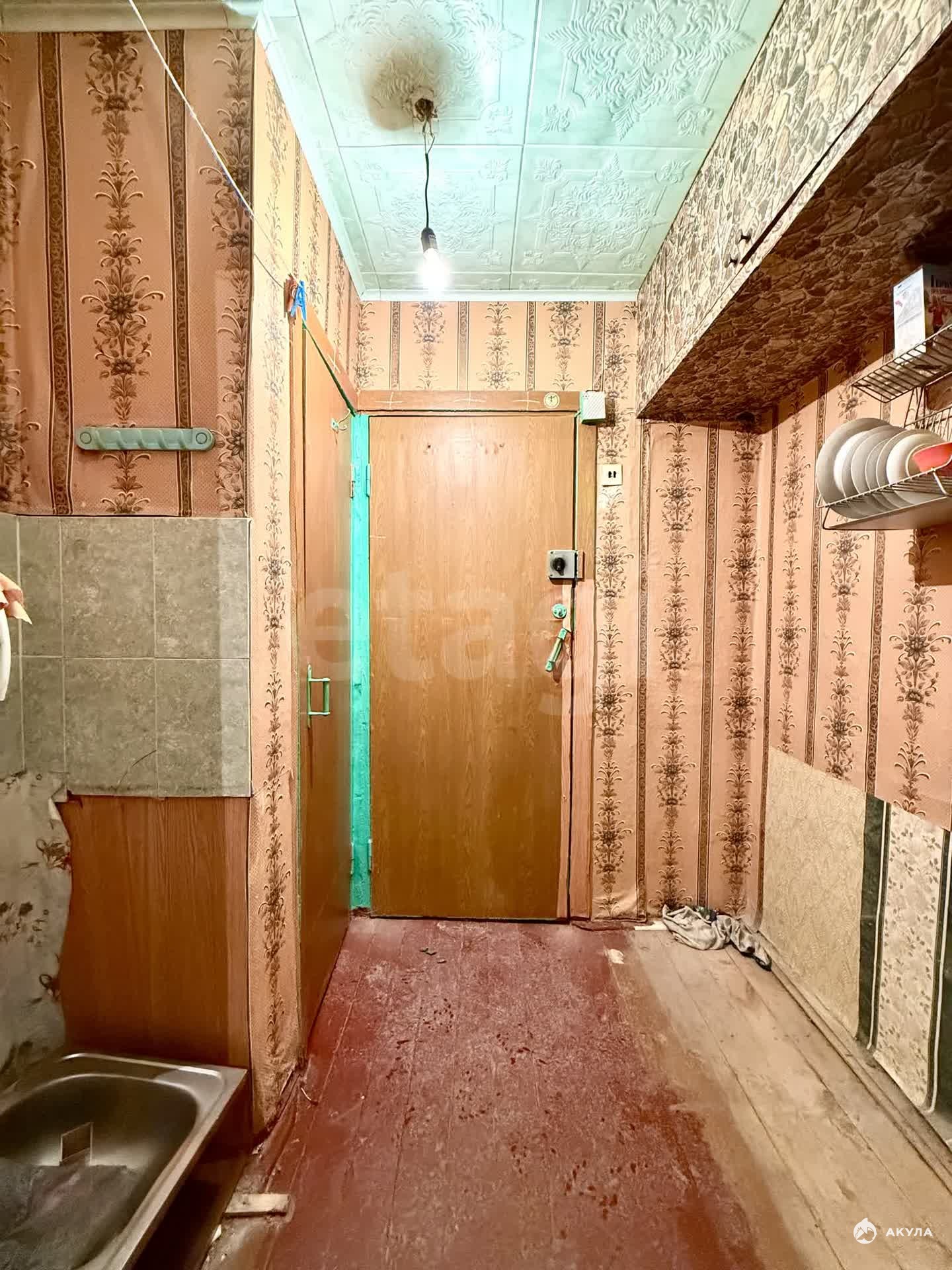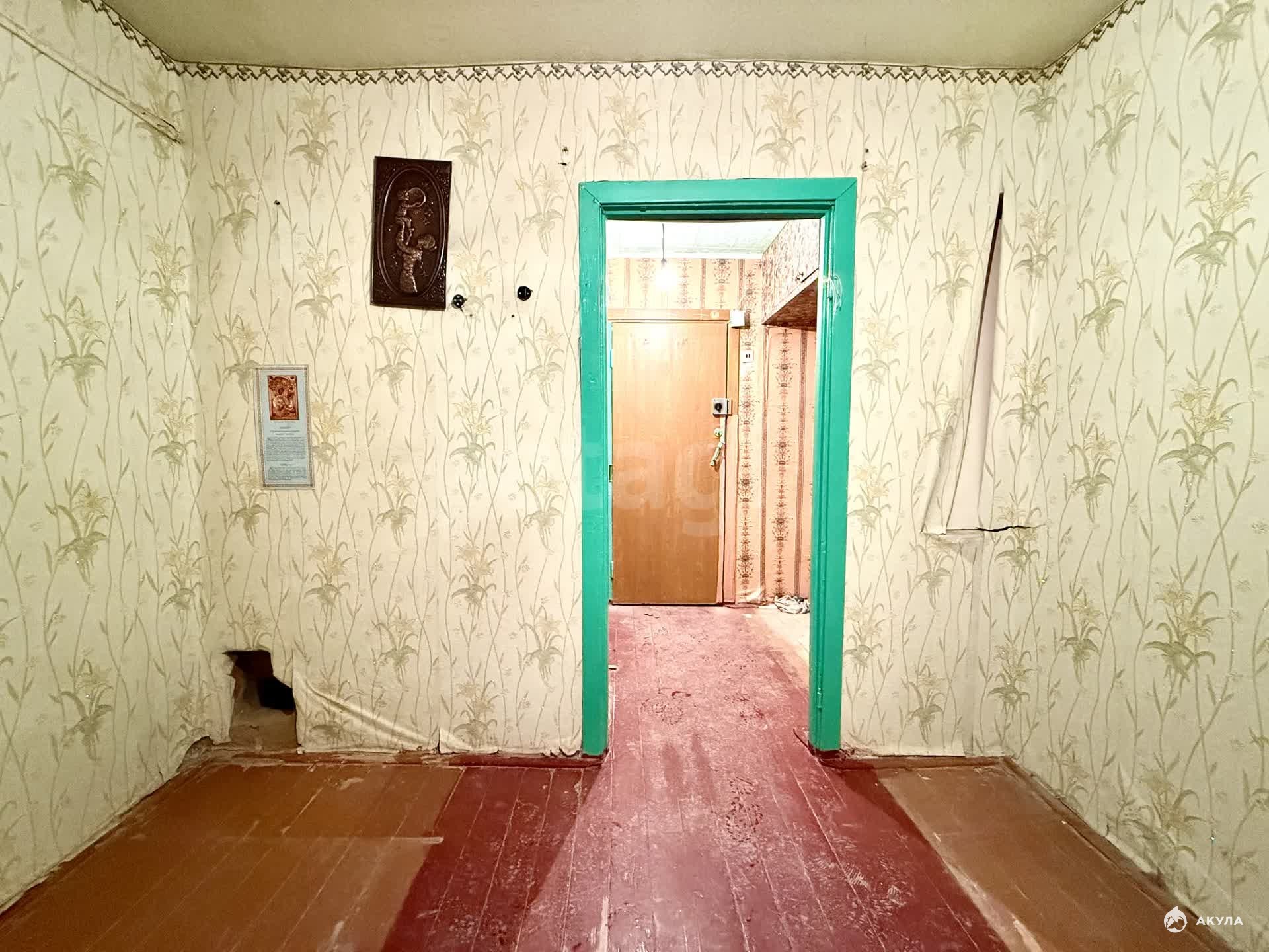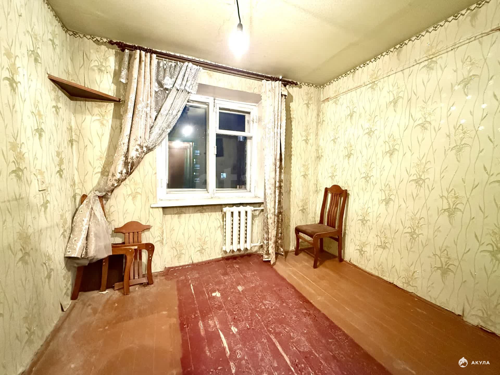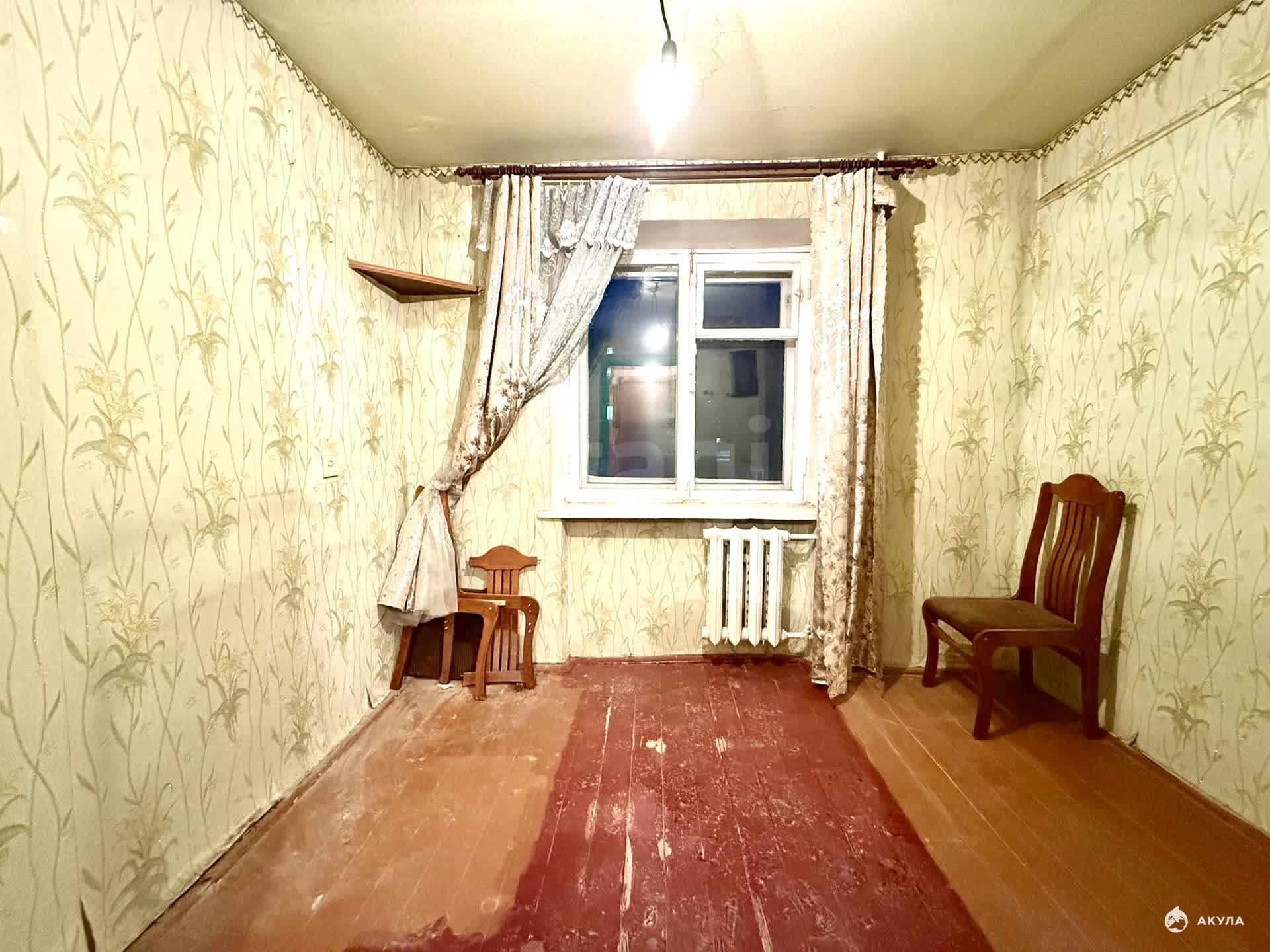 Квартира требует ремонта. Окно, полы, входная дверь — деревянные.