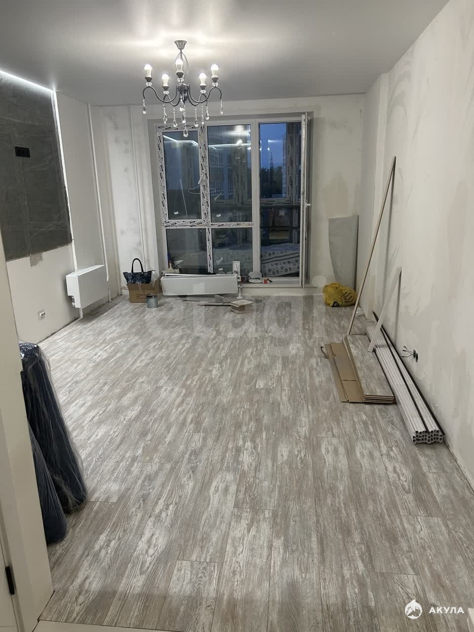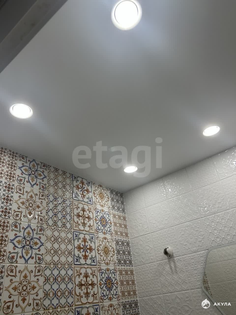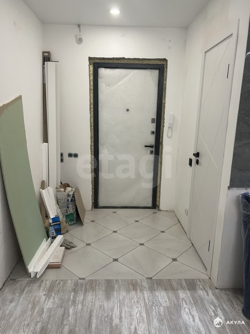 В квартире новый современный ремонт. На полу при входе керамогранит, в комнате ламинат 33 класса. Кухонный фартук отделан керамогранитом. Натяжной потолок с точечным освещением.