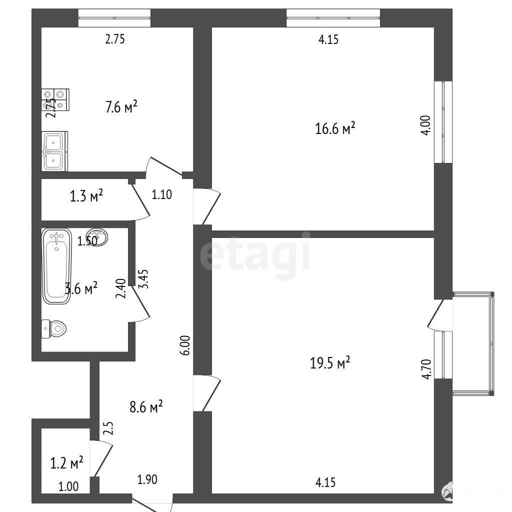 Площадь квартиры составляет 58, 4 кв. м, включает 2 изолированные комнаты 16, 6 и 19, 5 кв. м, кухню 7, 6 кв. м, раздельный санузел, а также кладовую для хранения.