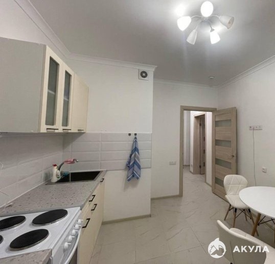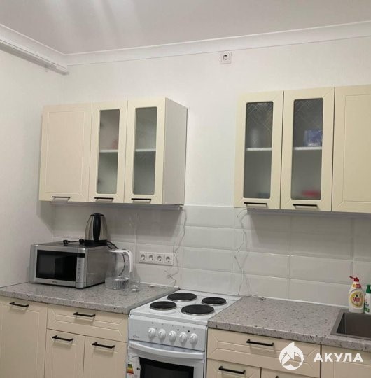 Полностью оборудованная кухня: холодильник, плита с 4 конфорками, духовка, микроволновка, электрический чайник, небольшой набор посуды.