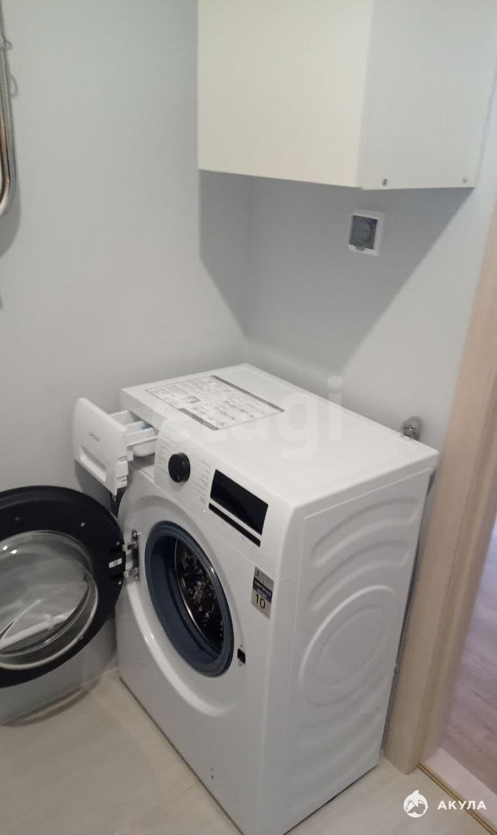 Кровать, диван, стиральная машинка, телевизор, шкаф для хранение вещей.