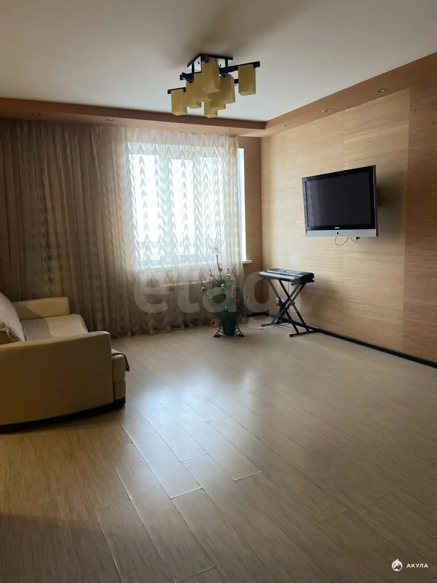 В просторной и светлой гостиной уютный диван, большой телевизор.