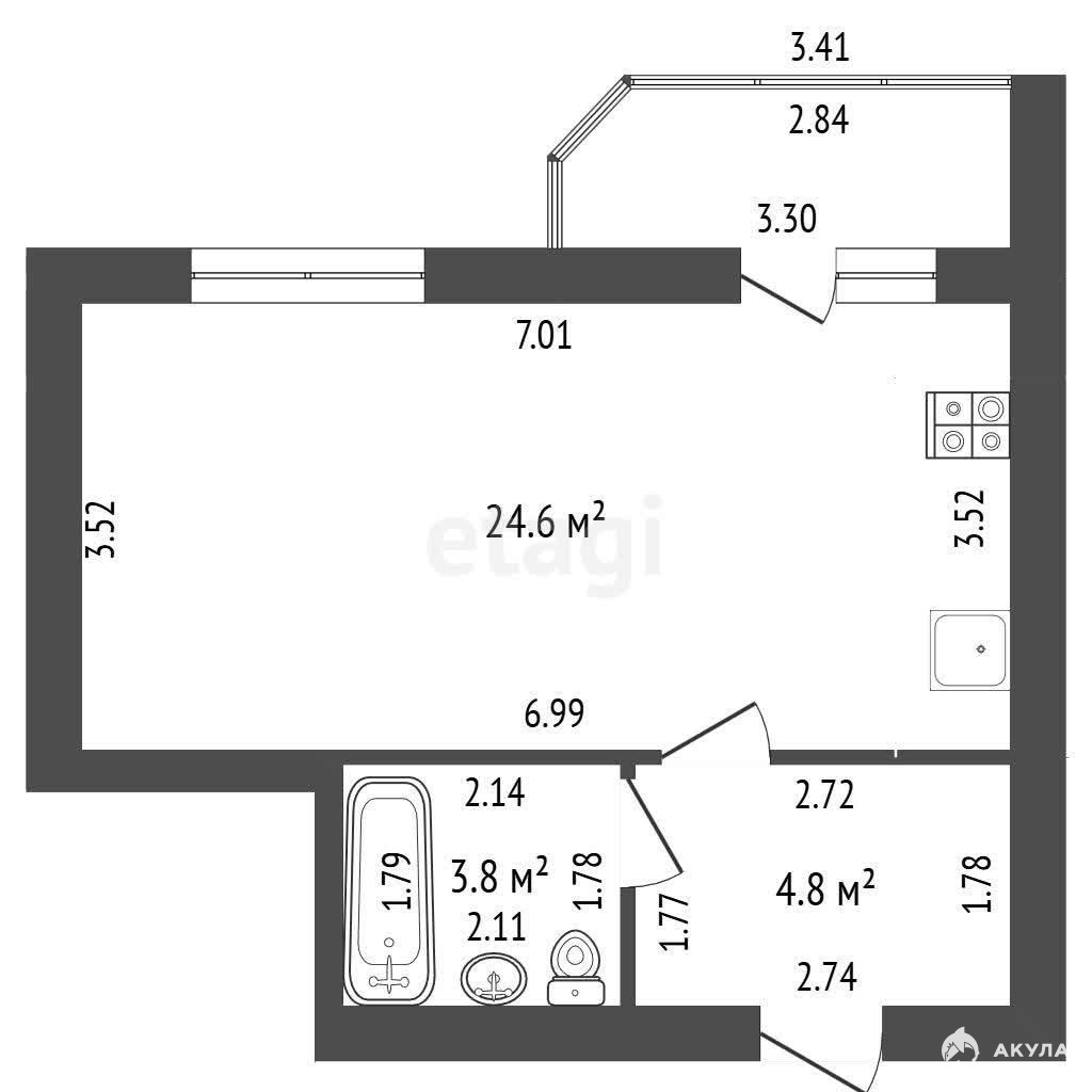 - в комнате имеется перегородка, которая делит пространство на 2 зоны и превращает студию в 1-комнатную квартиру;